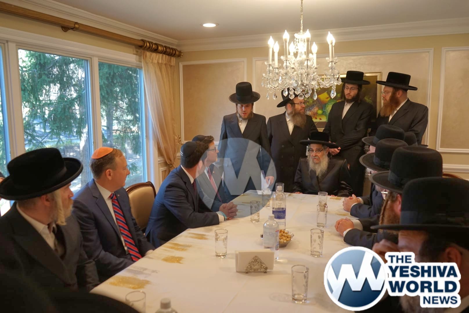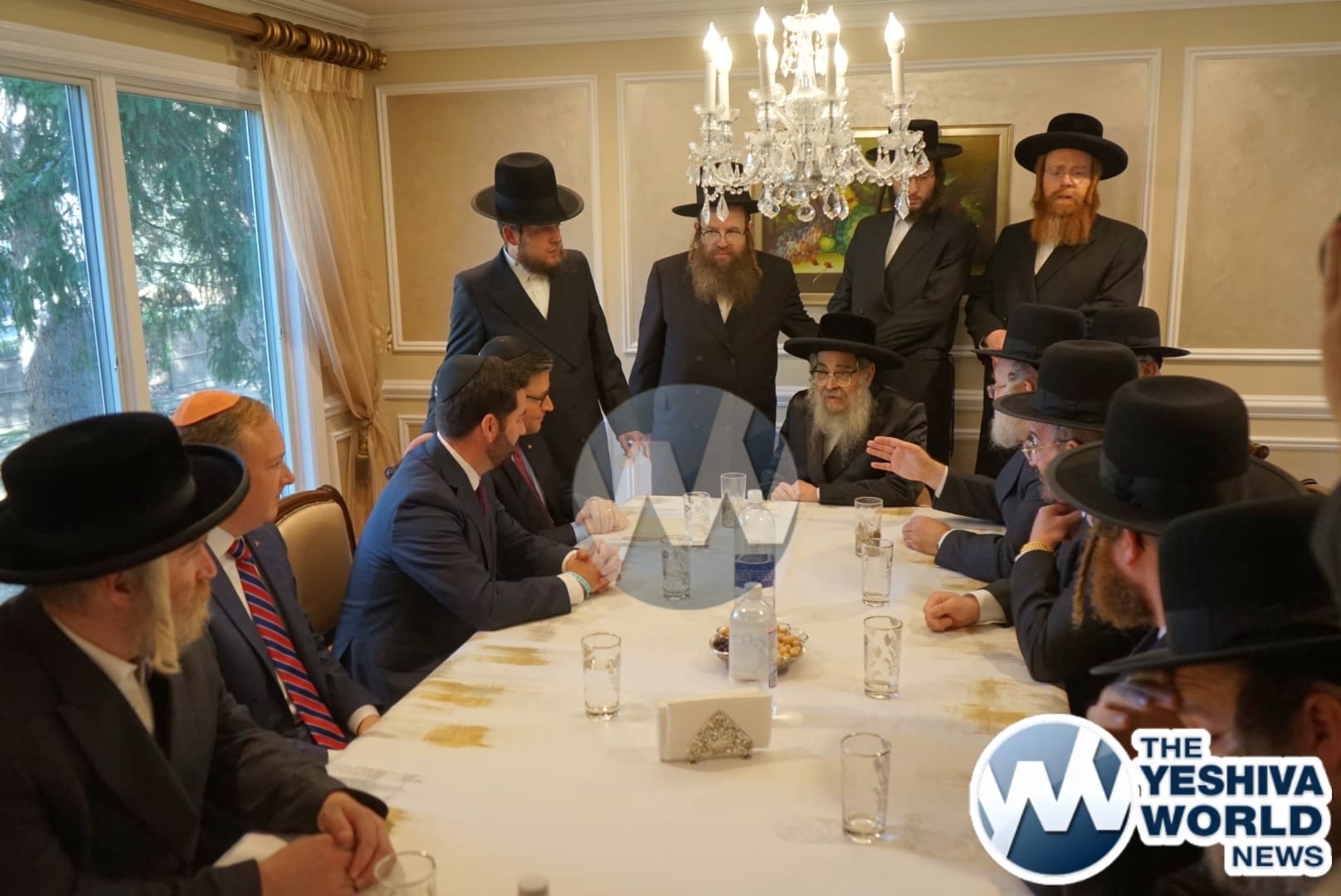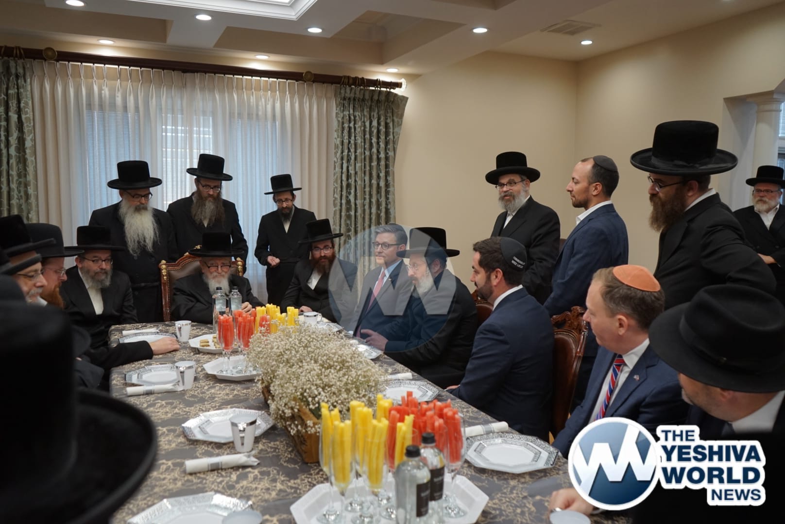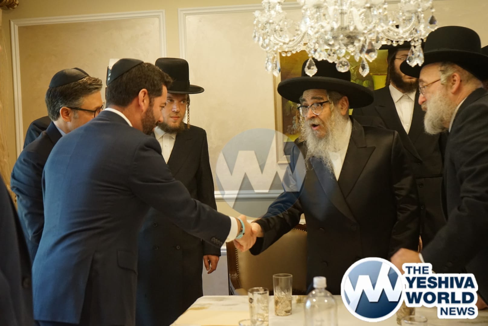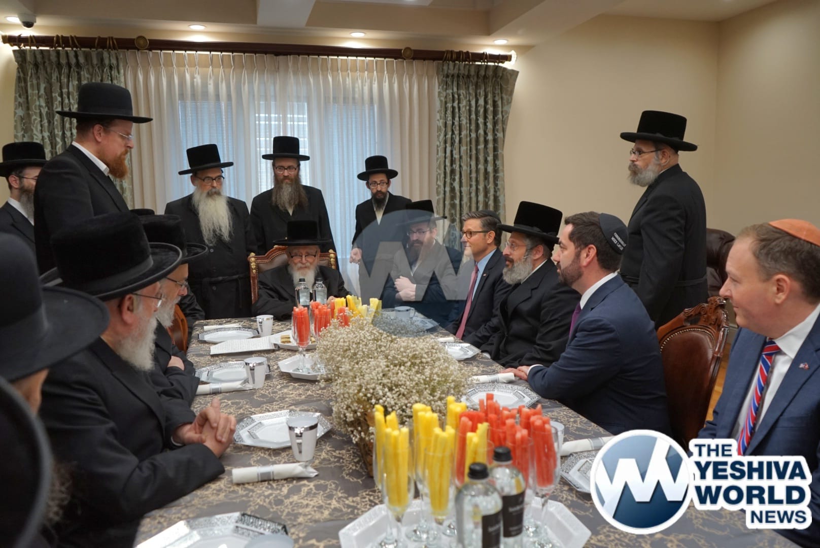 The delegation’s first stop was in Monsey, where they met with the Viznitzer Rebbe. Speaker Johnson then proceeded to meet with the Satmar Rebbe of Kiryas Joel, HaRav Aron Teitelbaum Shlita, who made a special trip to Monsey from Kiryas Joel, greeting the Speaker at his vacation residence.