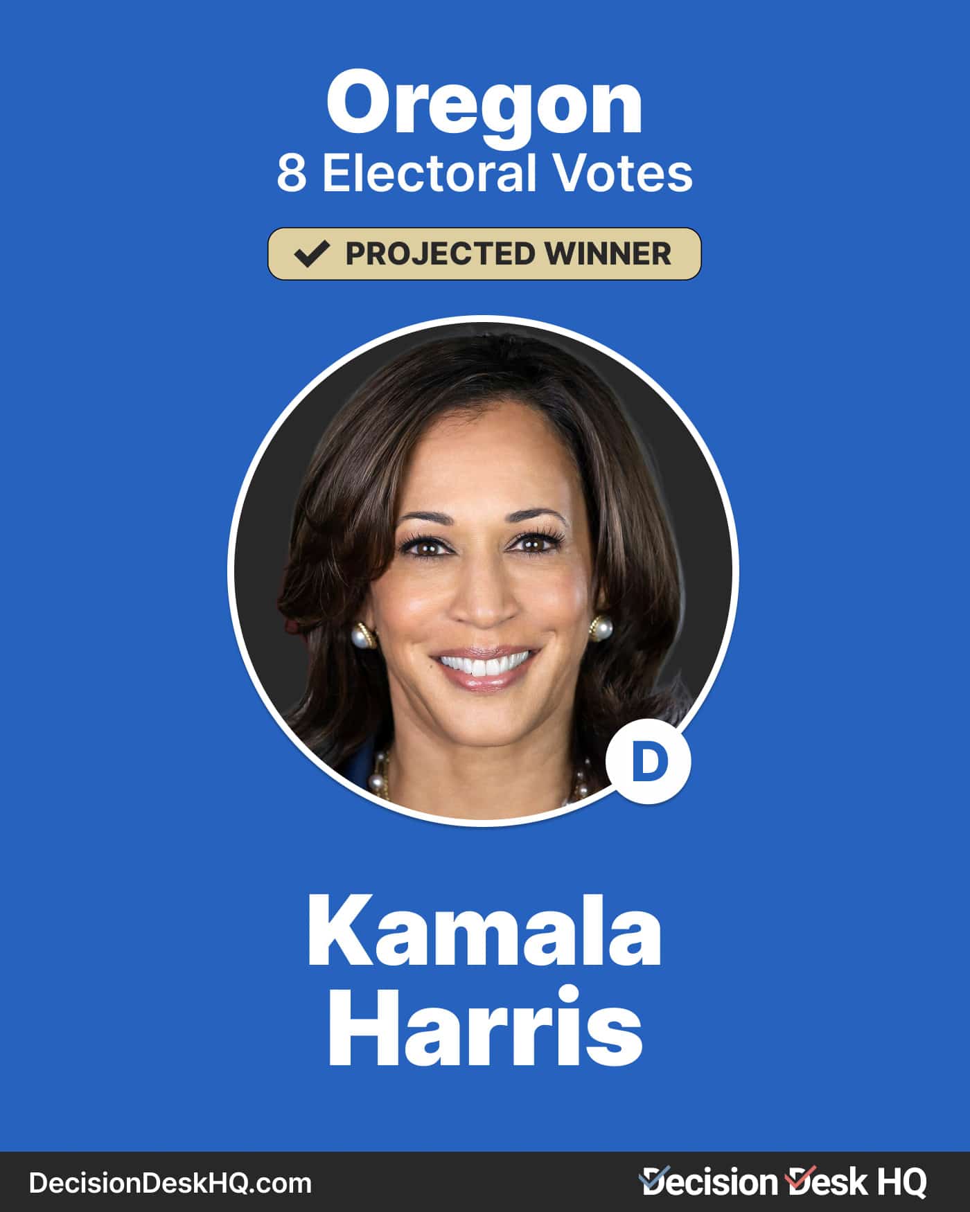 Kamala Harris gets another 8 electoral votes from Oregon, now giving her 208 votes. Trump still at 247.