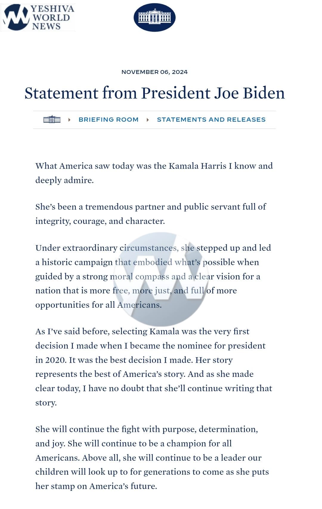 In his first remarks after her election loss to President-elect Trump, Biden said Harris ran a “historic campaign that embodied what’s possible when guided by a strong moral compass and a clear vision for a nation that is more free, more just, and full of more opportunities for all Americans.”