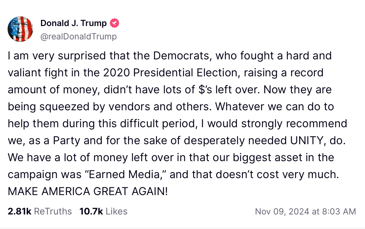 On Truth Social, Trump wrote, “I am very surprised that the Democrats, who fought a hard and valiant fight in the 2024 Presidential Election, raising a record amount of money, didn’t have lots of $’s left over. Now they are being squeezed by vendors and others. Whatever we can do to help them during this difficult period, I would strongly recommend we, as a Party and for the sake of desperately needed UNITY, do.” Trump highlighted that the GOP had substantial funds left over from campaign efforts, thanks to what he described as “earned media,” or unpaid publicity.