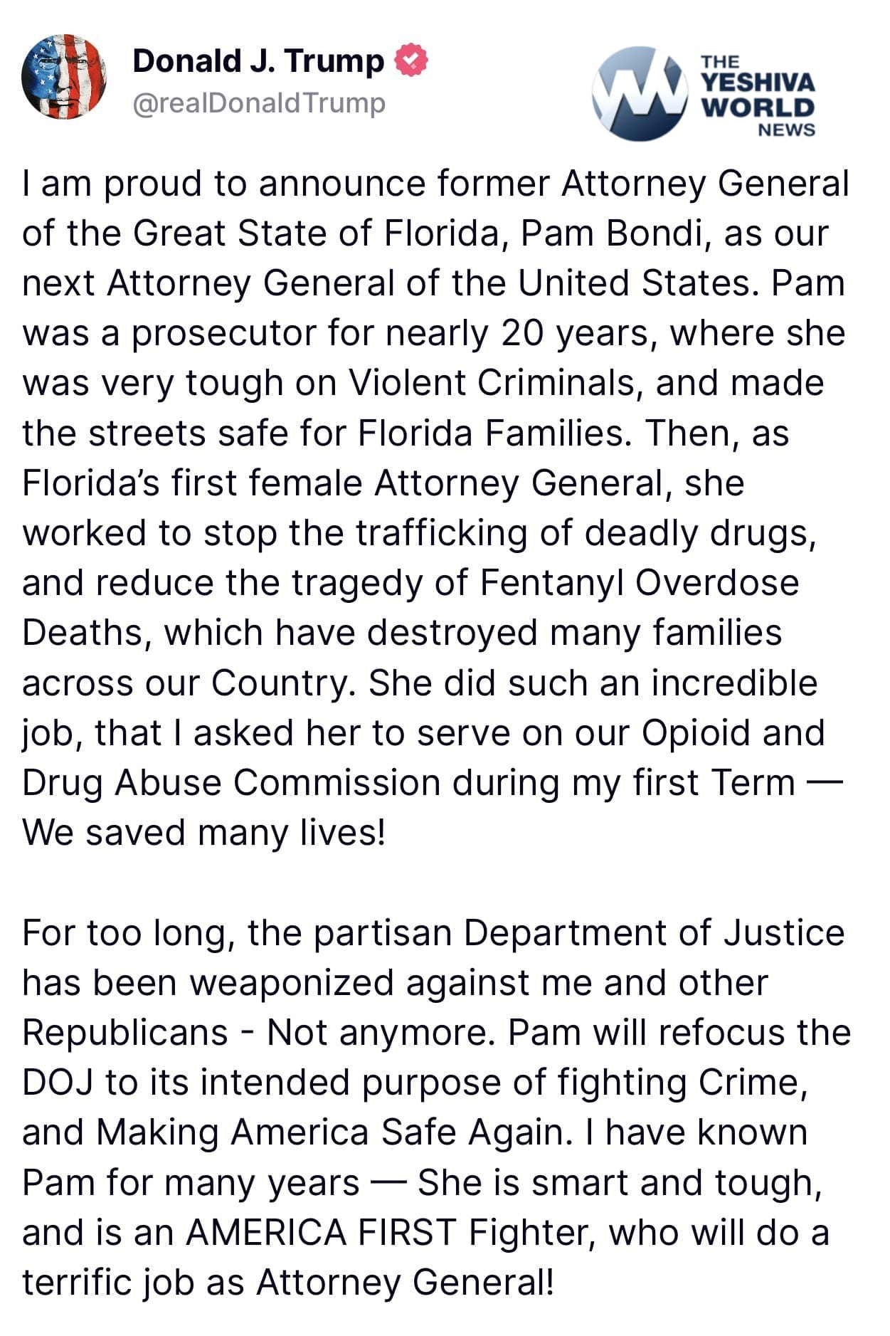 “For too long, the partisan Department of Justice has been weaponized against me and other Republicans – Not anymore,” Trump said in a social media post. “Pam will refocus the DOJ to its intended purpose of fighting Crime, and Making America Safe Again.”