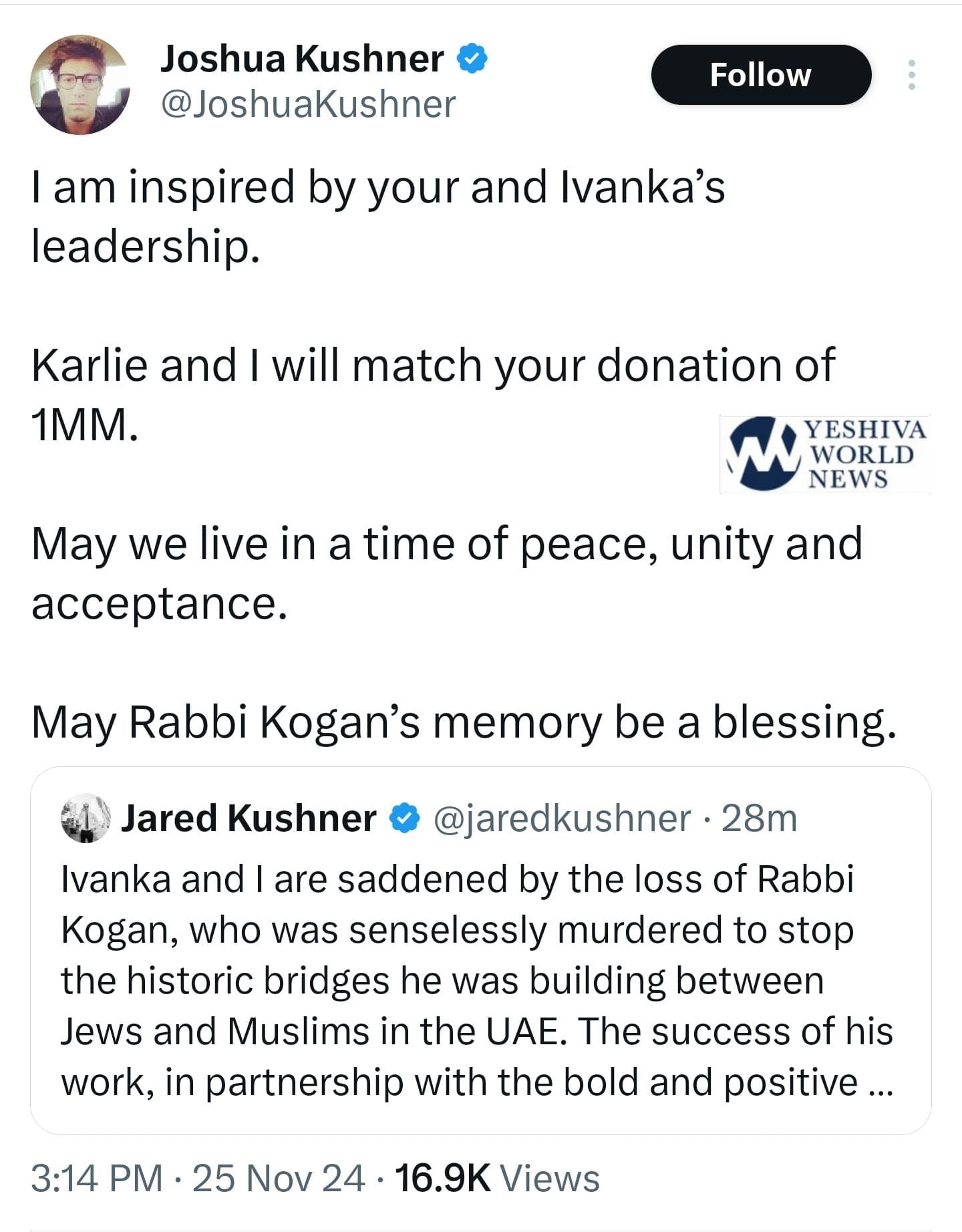 Jared’s brother, Joshua Kushner, followed up the announcement by saying that he was “inspired” by their gift and that he too will be donating $1 million the Chabad of UAE.