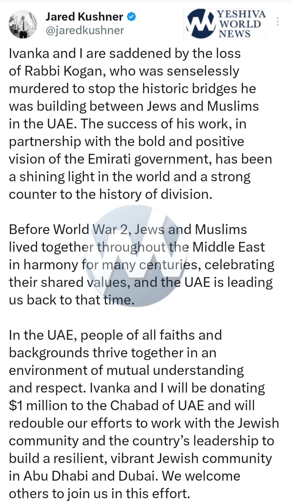 In a statement shared on X, Kushner and his wife, Ivanka Trump, expressed their grief over Rabbi Kogan’s murder, describing it as an attempt to undermine the bridges he was building between Jews and Muslims in the UAE.