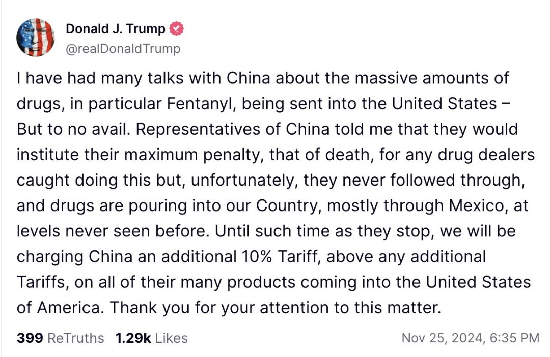 “I have had many talks with China about the massive amounts of drugs, in particular Fentanyl, being sent into the United States – But to no avail,” he stated. “Until such time as they stop, we will be charging China an additional 10% Tariff, above any additional Tariffs, on all of their many products coming into the United States of America.”