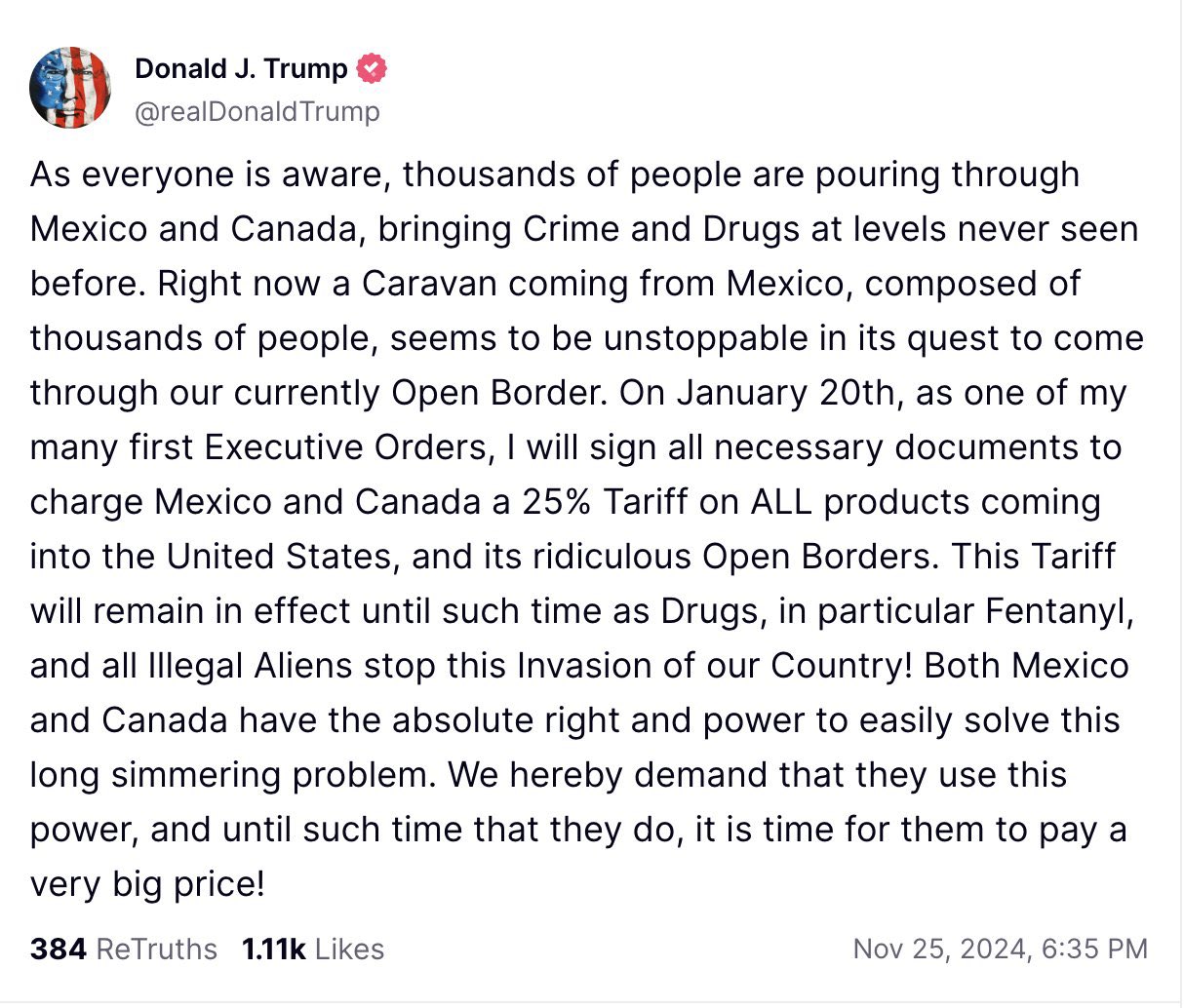 “On January 20th, as one of my many first Executive Orders, I will sign all necessary documents to charge Mexico and Canada a 25% Tariff on ALL products coming into the United States,” Trump said. “This Tariff will remain in effect until such time as Drugs, in particular Fentanyl, and all Illegal Aliens stop this Invasion of our Country! Both Mexico and Canada have the absolute right and power to easily solve this long-simmering problem.”