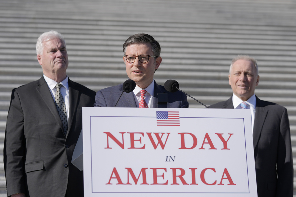 Speaker of the House Mike Johnson, R-La., center, speaks as House Majority Whip Tom Emmer, R-Minn., left, and Majority Leader Steve Scalise, R-La., right, listen during a press conference on the steps of the U.S. Capitol in Washington, Tuesday, Nov. 12, 2024, in Washington. (AP Photo/Mariam Zuhaib)