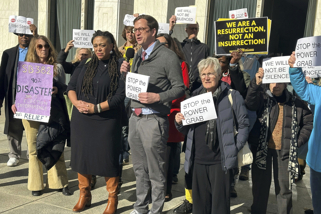 The Rev. Rob Stephens with the NC Poor People's Campaign speaks at a news conference outside the North Carolina Legislative Building in Raleigh, N.C. on Monday, Dec. 2, 2024. (AP Photo/Gary D. Robertson)