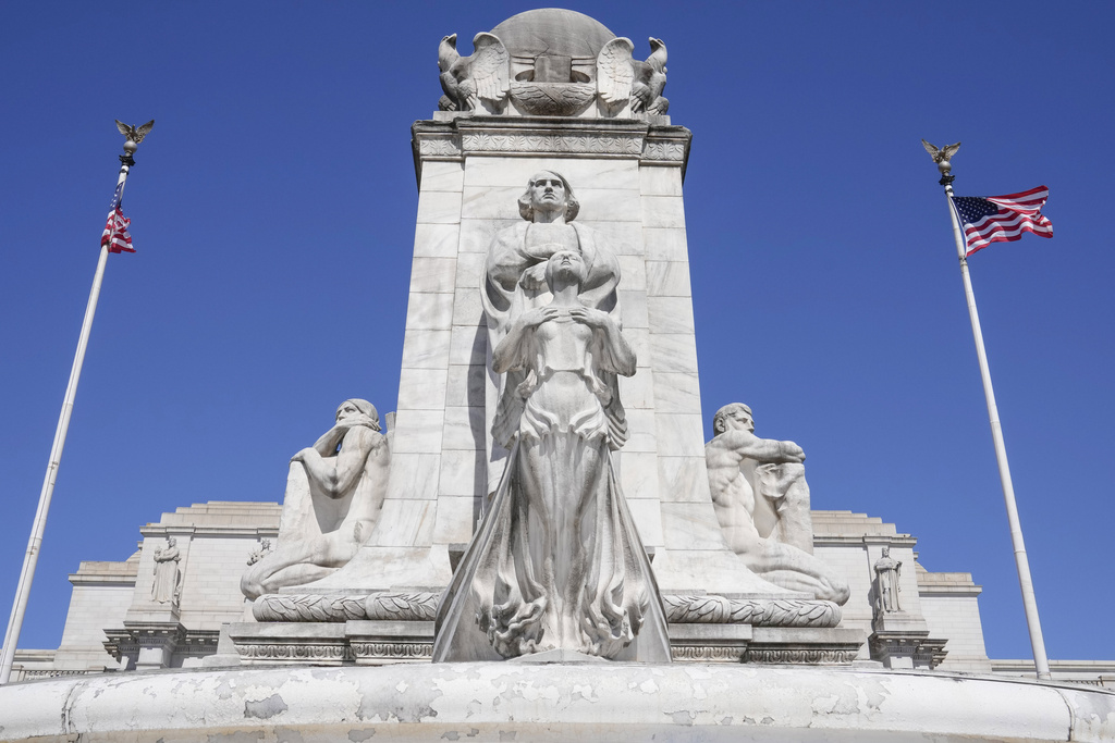 Outside Union Station, protesters spray painted graffiti on a monument to Christopher Columbus and hoisted Palestinian flags in place of the American flags that were removed.