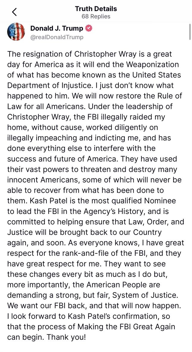 Wray’s intended resignation is not unexpected considering that Trump had settled on Patel to be director and had repeatedly aired his ire at Wray, including in a television interview broadcast Sunday. By stepping down rather than waiting to be fired, Wray is trying to avert a collision with the new Trump administration that he said would have further entangled the FBI “deeper into the fray.”