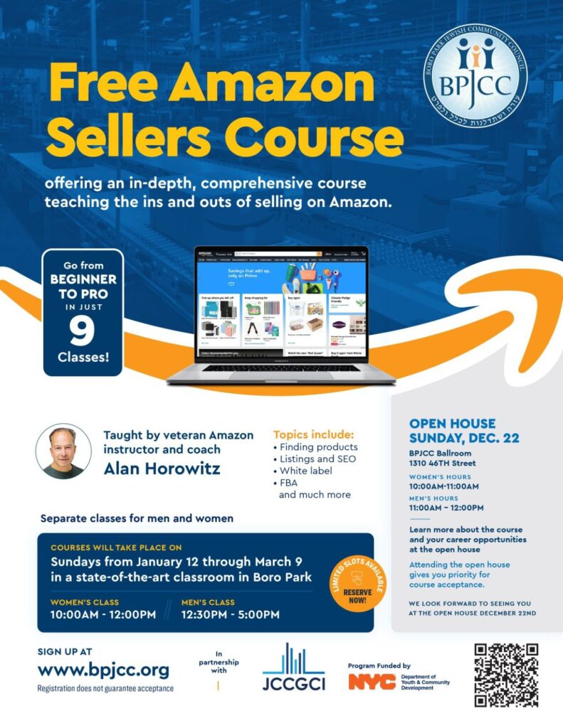 Due to popular demand, the BPJCC will again offer a free series of Amazon Sellers Courses to Boro Parkers. After over 200 interested individuals signed up for the last course, the BPJCC realized the vast need for a course on this topic and, therefore, expanded the offering. This time around, there will be a separate course for both men and women.