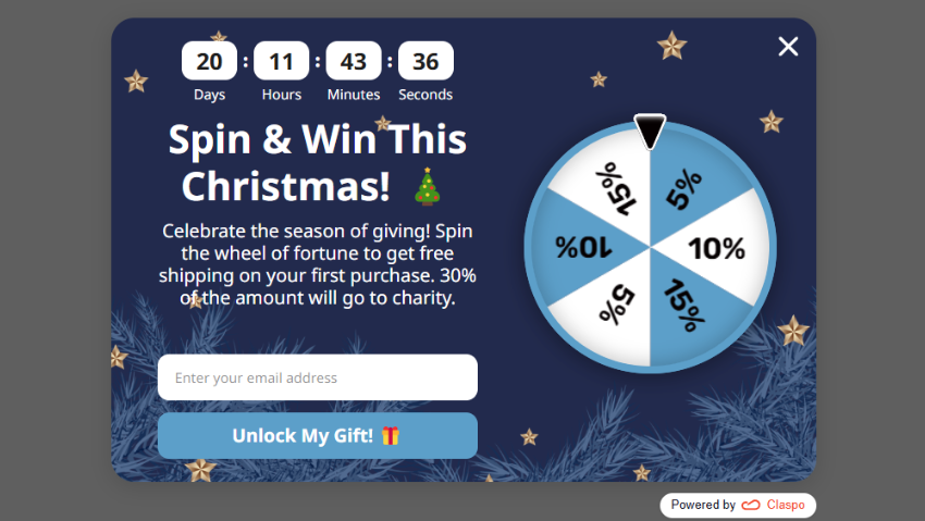 Spin-the-Wheel Popup. Lucky wheel, wheel of fortune, spin-to-win… This popup adds a thrill of anticipation for visitors. Users click to spin a wheel for a chance to win a reward. The interactive nature of this format keeps visitors engaged while also fostering curiosity about what they might win. Spin-the-wheel popups can be a powerful tool for increasing participation and creating a memorable user experience.