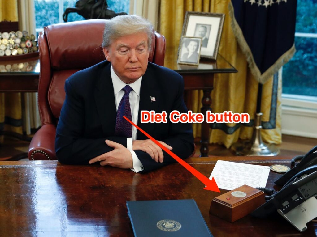 During his presidency, Trump would press the red button to summon a Diet Coke, which his valet, Walt Nauta, would promptly deliver on a silver tray. The button was removed by President Joe Biden upon taking office.