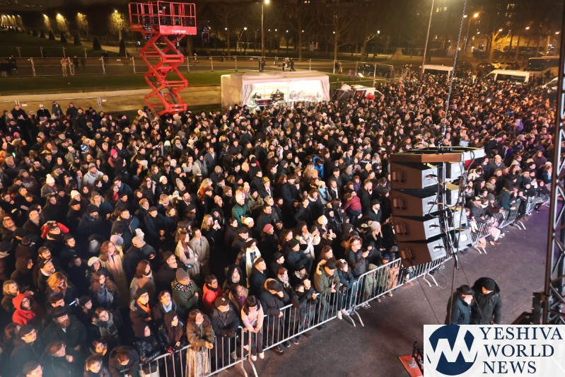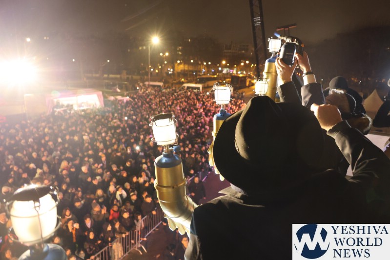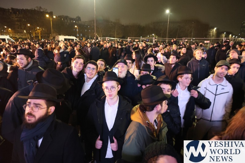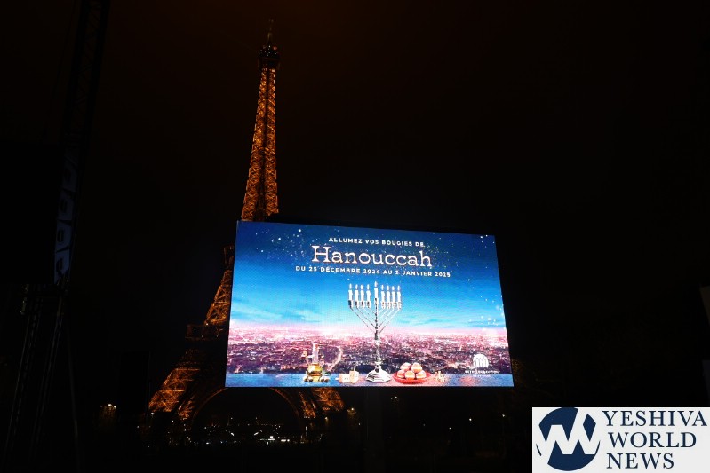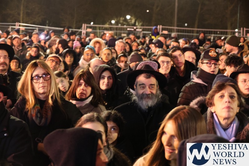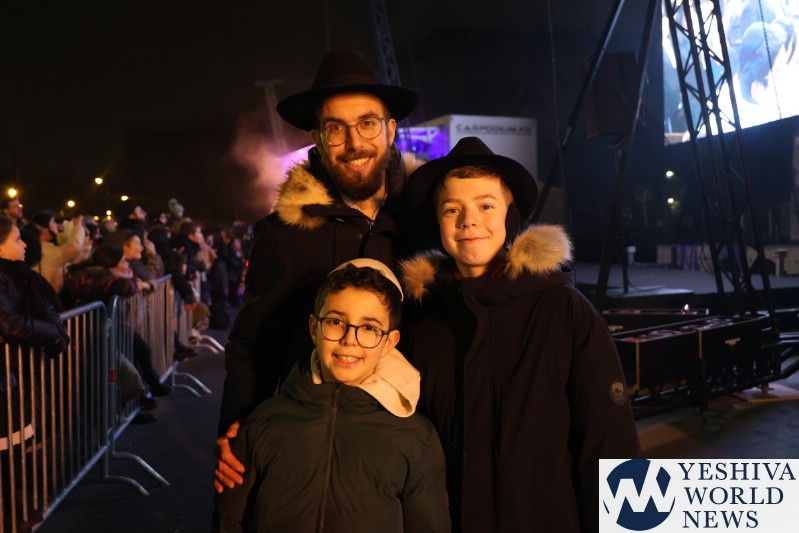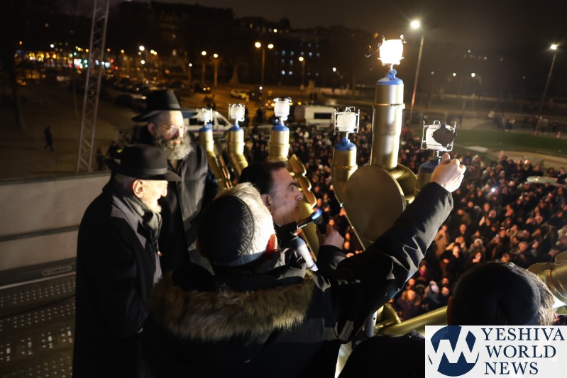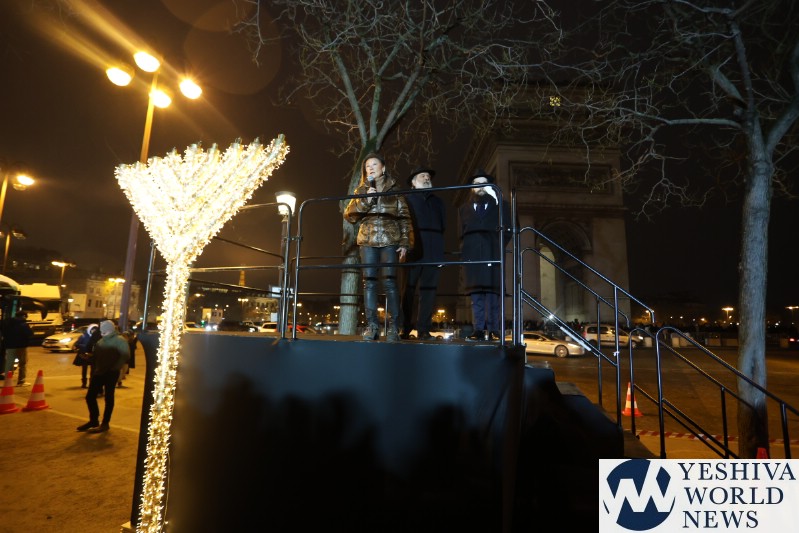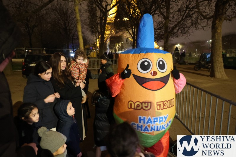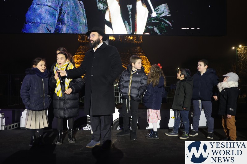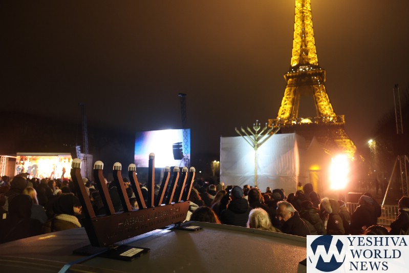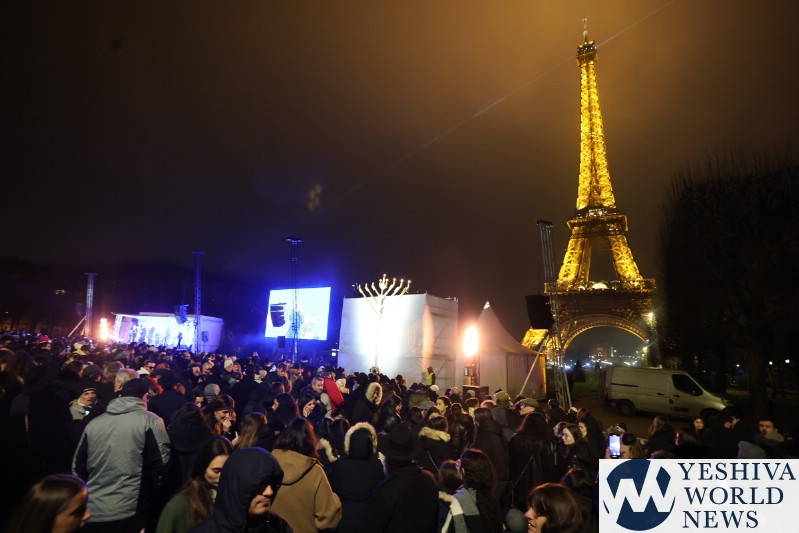 A large crowd gathered in front of the Eiffel Tower for the lighting of the fifth Chanukah candle.