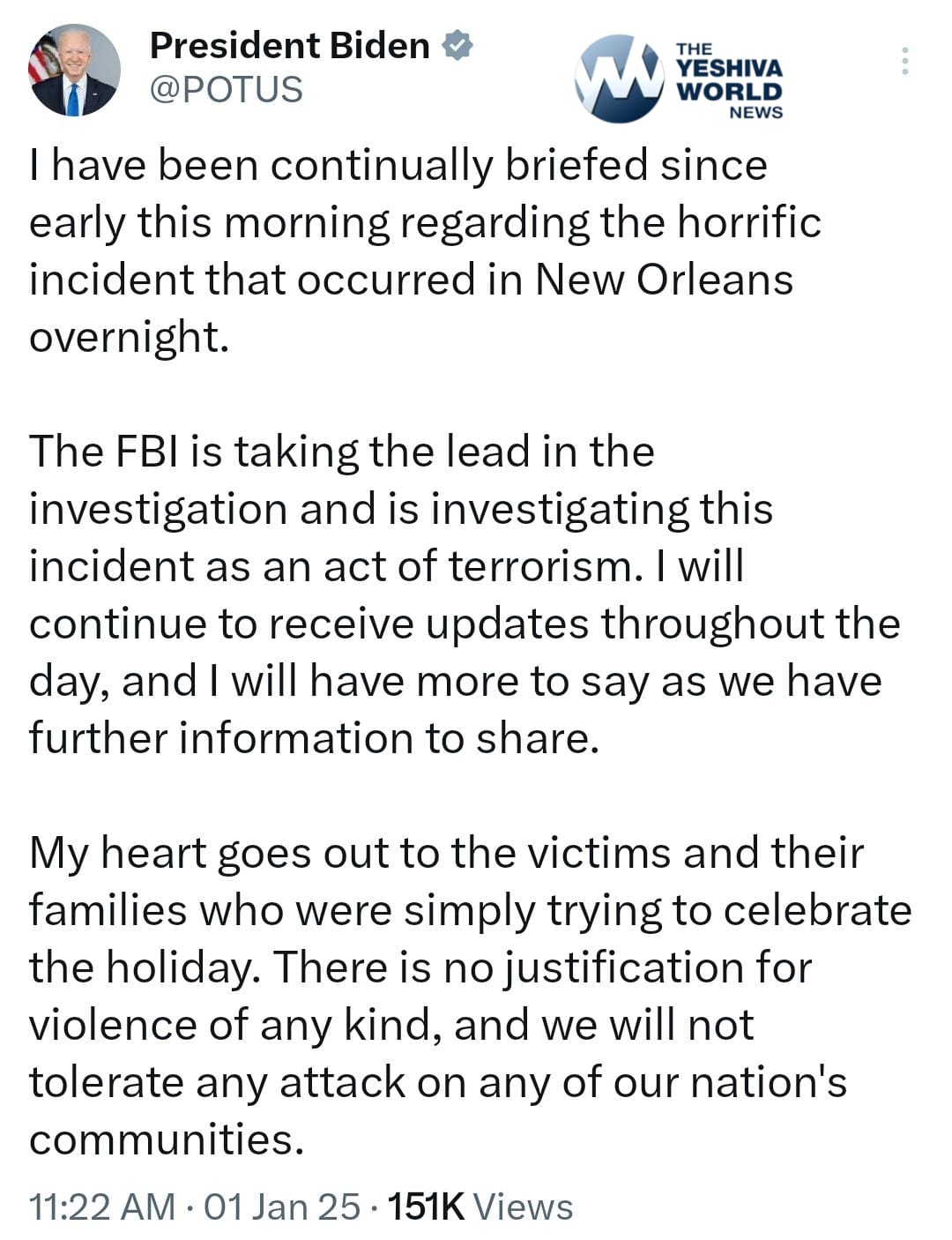 President Joe Biden said the FBI is investigating the “horrific incident” as “an act of terrorism” and that he has directed his team to ensure every resource is available as authorities work to “get to the bottom of what happened as quickly as possible.”