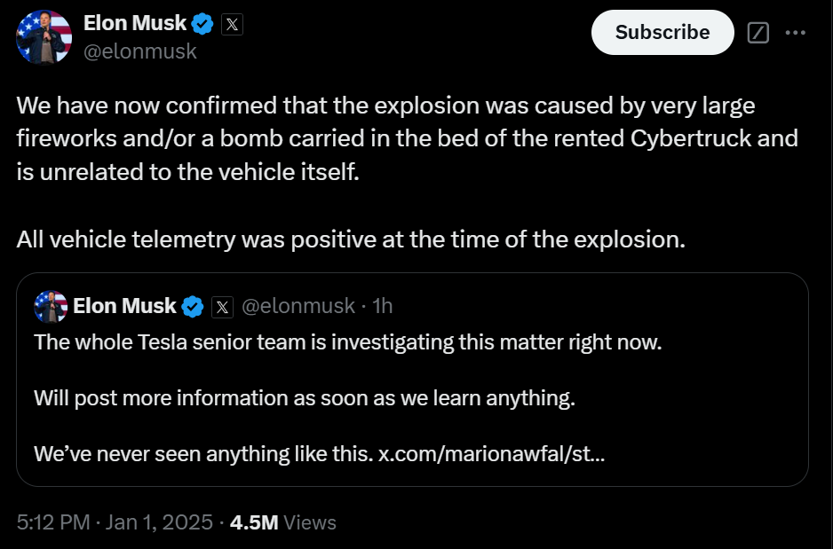 Tesla CEO Elon Musk tweeted: “We have now confirmed that the explosion was caused by very large fireworks and/or a bomb carried in the bed of the rented Cybertruck and is unrelated to the vehicle itself. All vehicle telemetry was positive at the time of the explosion.”