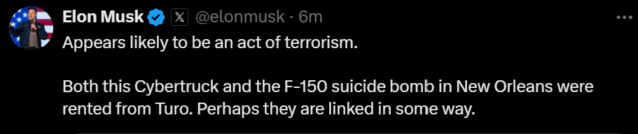 Law enforcement currently assesses that the explosion was most likely intentional. Curiously, the Cybertruck was rented through the Turo app – the same platform used by the New Orleans terrorist who killed 15 people and injured dozens early Wednesday morning.