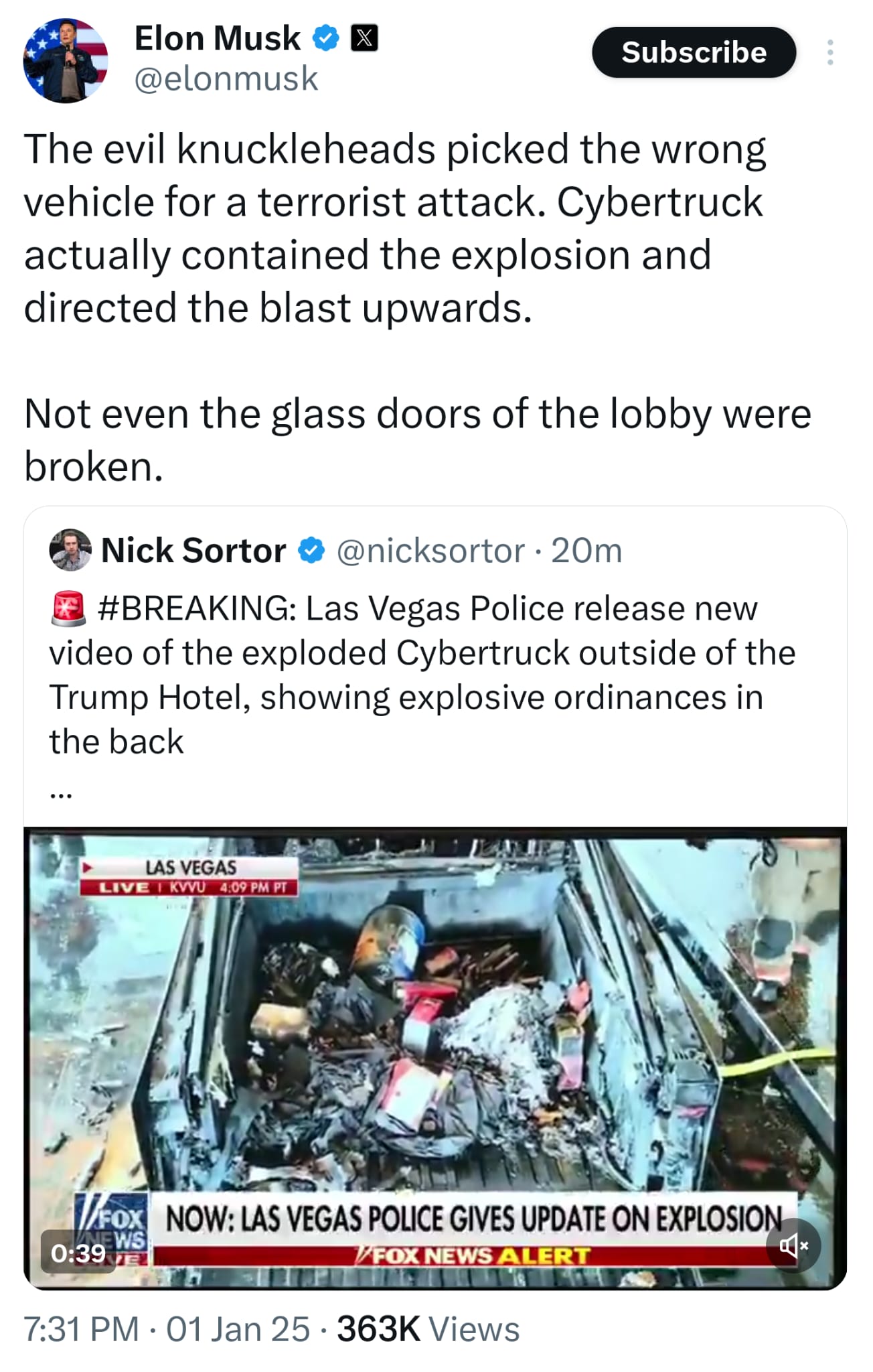 In a social media post on X, Tesla CEO Elon Musk responded to the incident, highlighting the vehicle’s unexpected role in thwarting further destruction. “The evil knuckleheads picked the wrong vehicle for a terrorist attack. Cybertruck actually contained the explosion and directed the blast upwards,” Musk wrote.