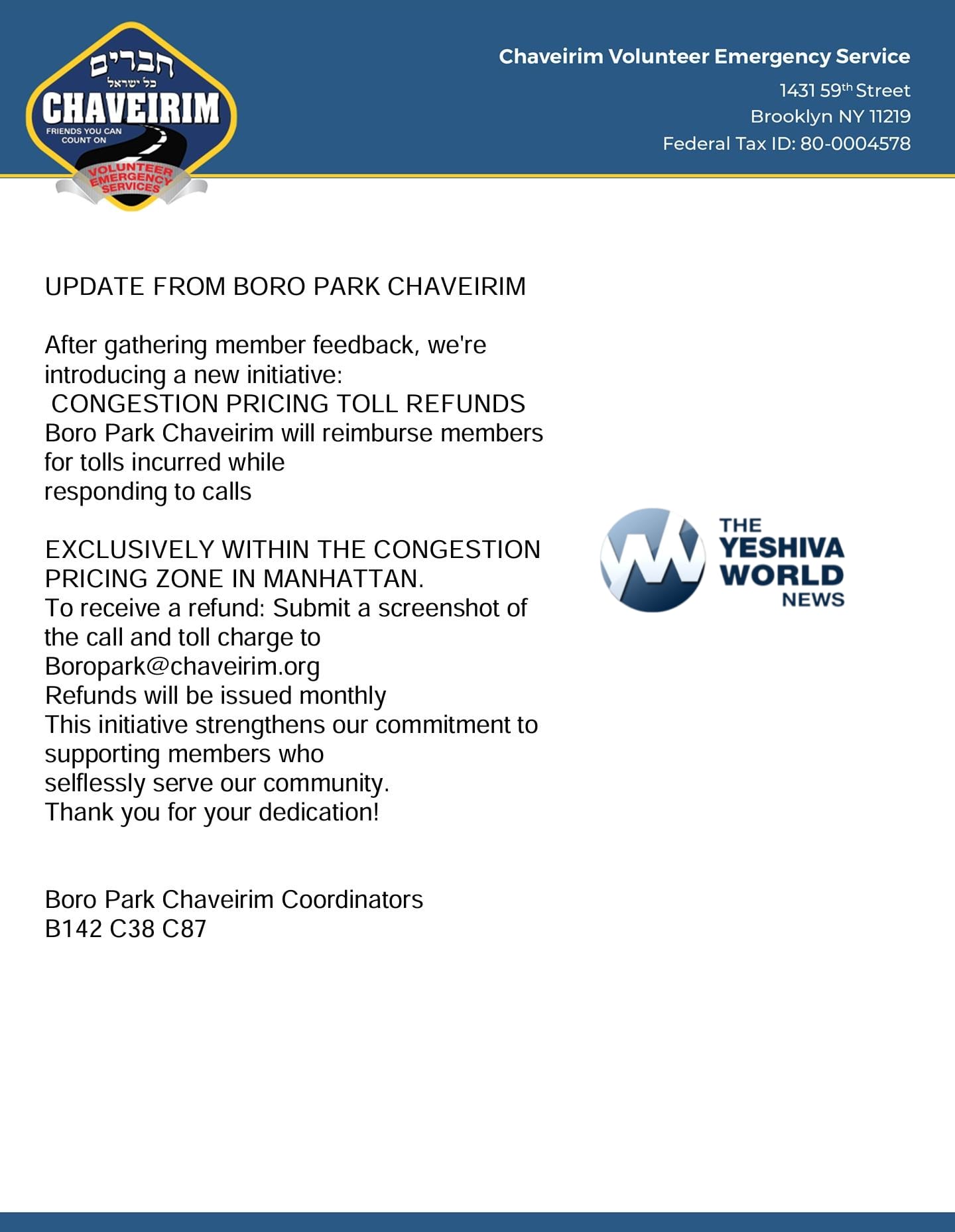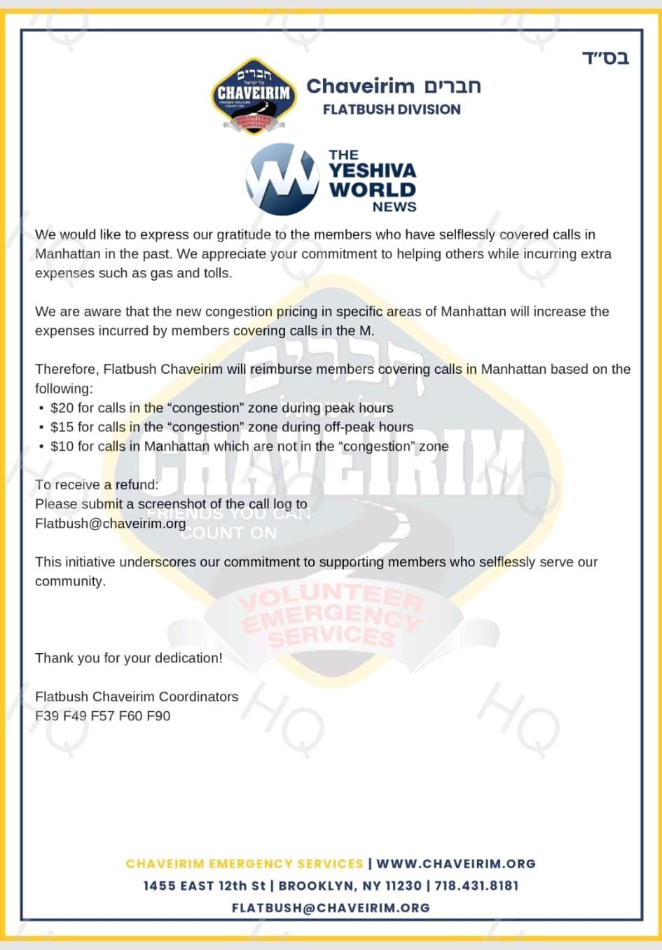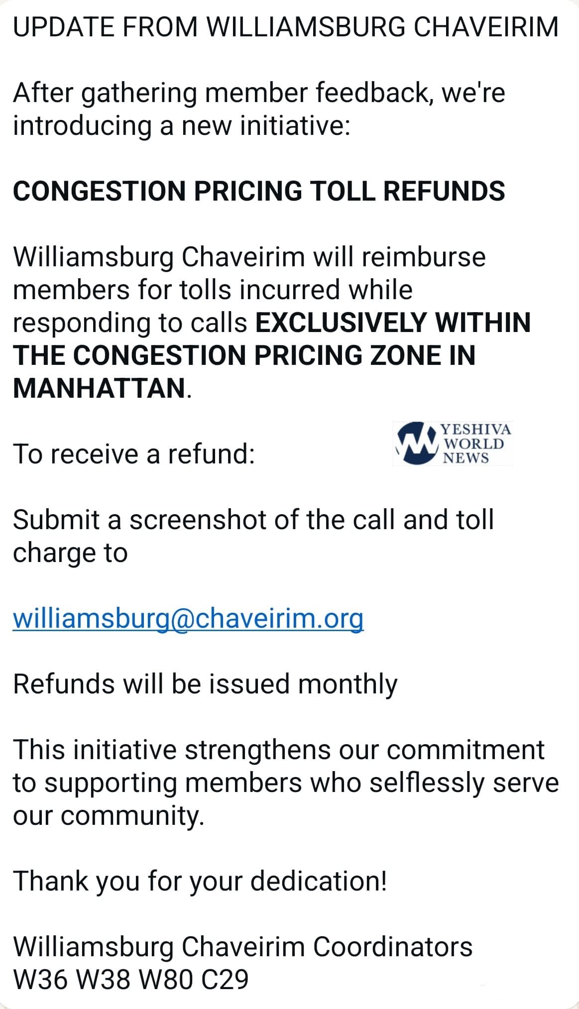 In response to New York City’s new congestion pricing tolls, Williamsburg, Boro Park and Flatbush Chaveirim have announced initiatives to reimburse volunteers for tolls incurred while responding to calls within Manhattan’s congestion pricing zone.