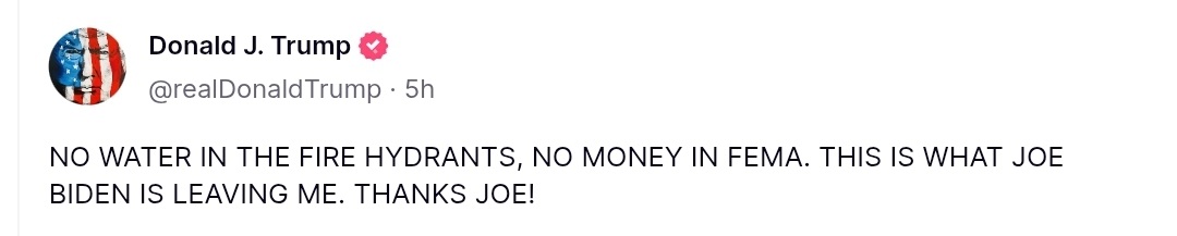 “NO WATER IN THE FIRE HYDRANTS, NO MONEY IN FEMA. THIS IS WHAT JOE BIDEN IS LEAVING ME. THANKS JOE!” Trump posted.