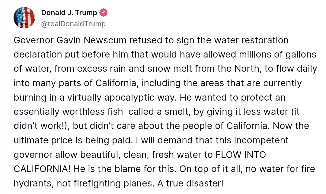 “He is the blame for this!” Trump wrote, as 100-mile-per-hour Santa Ana winds and bone-dry vegetation fueled the inferno. Trump’s scathing posts accused Newsom of refusing to sign a water restoration declaration that, according to Trump, would have diverted millions of gallons of rainwater and snowmelt to areas now consumed by fire.
