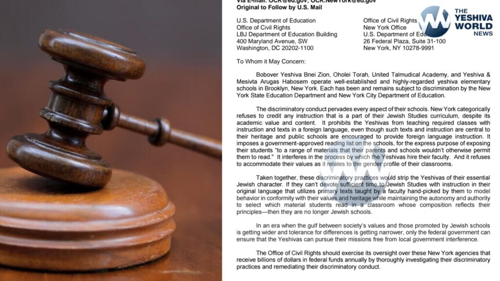 Among the charges is that New York has targeted Jewish Studies (limudei kodesh) classes for discriminatory treatment; prohibits yeshivas but not public schools from teaching required classes in a foreign language; and seeks to force yeshivas to use texts that they and their parent body find objectionable.