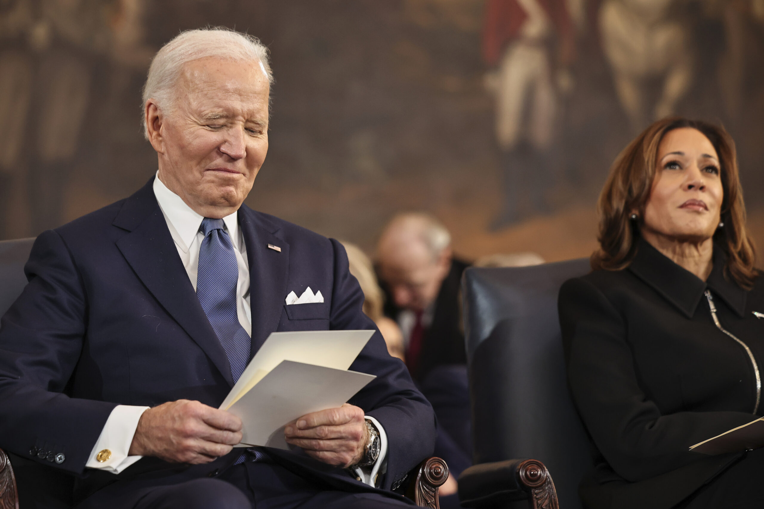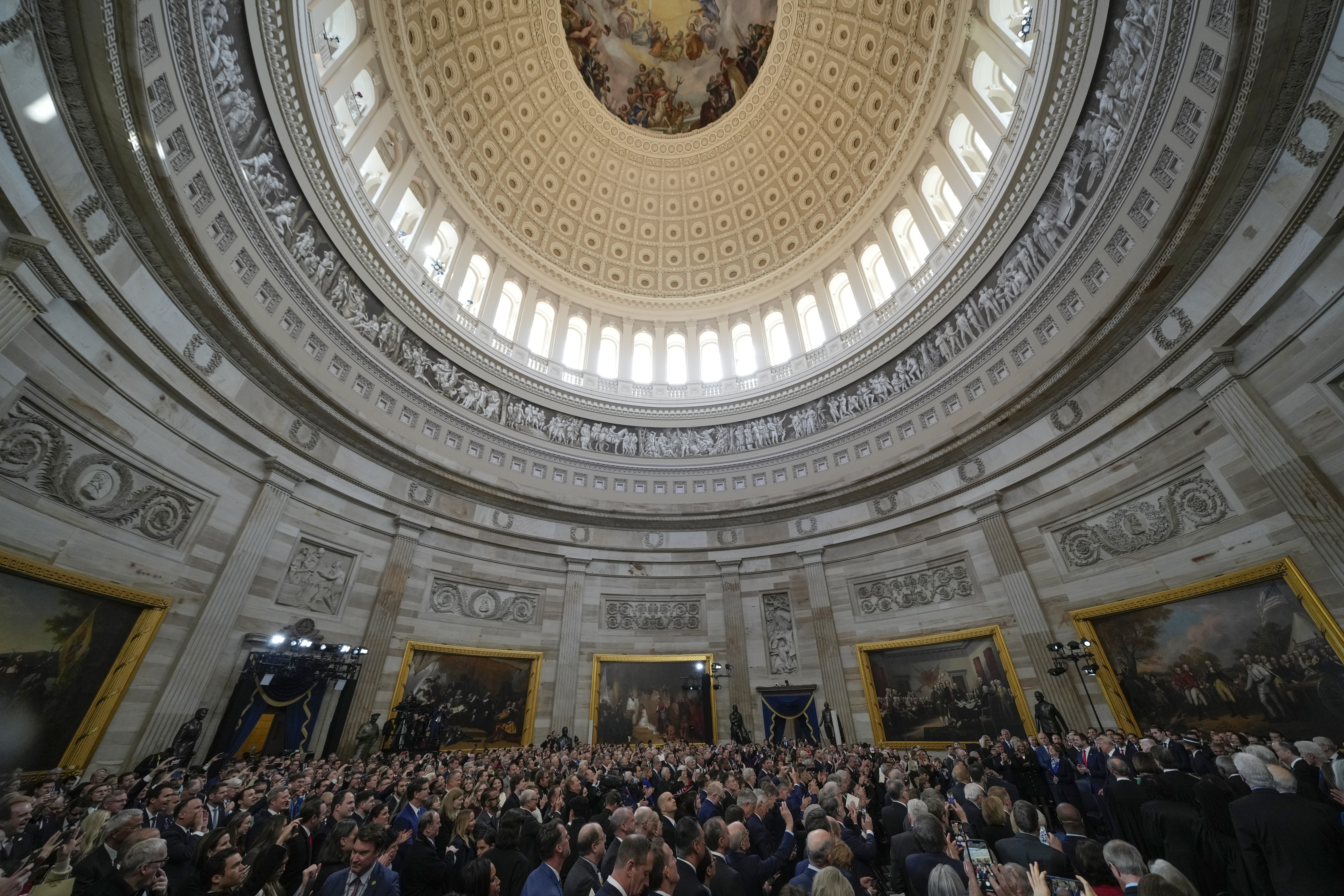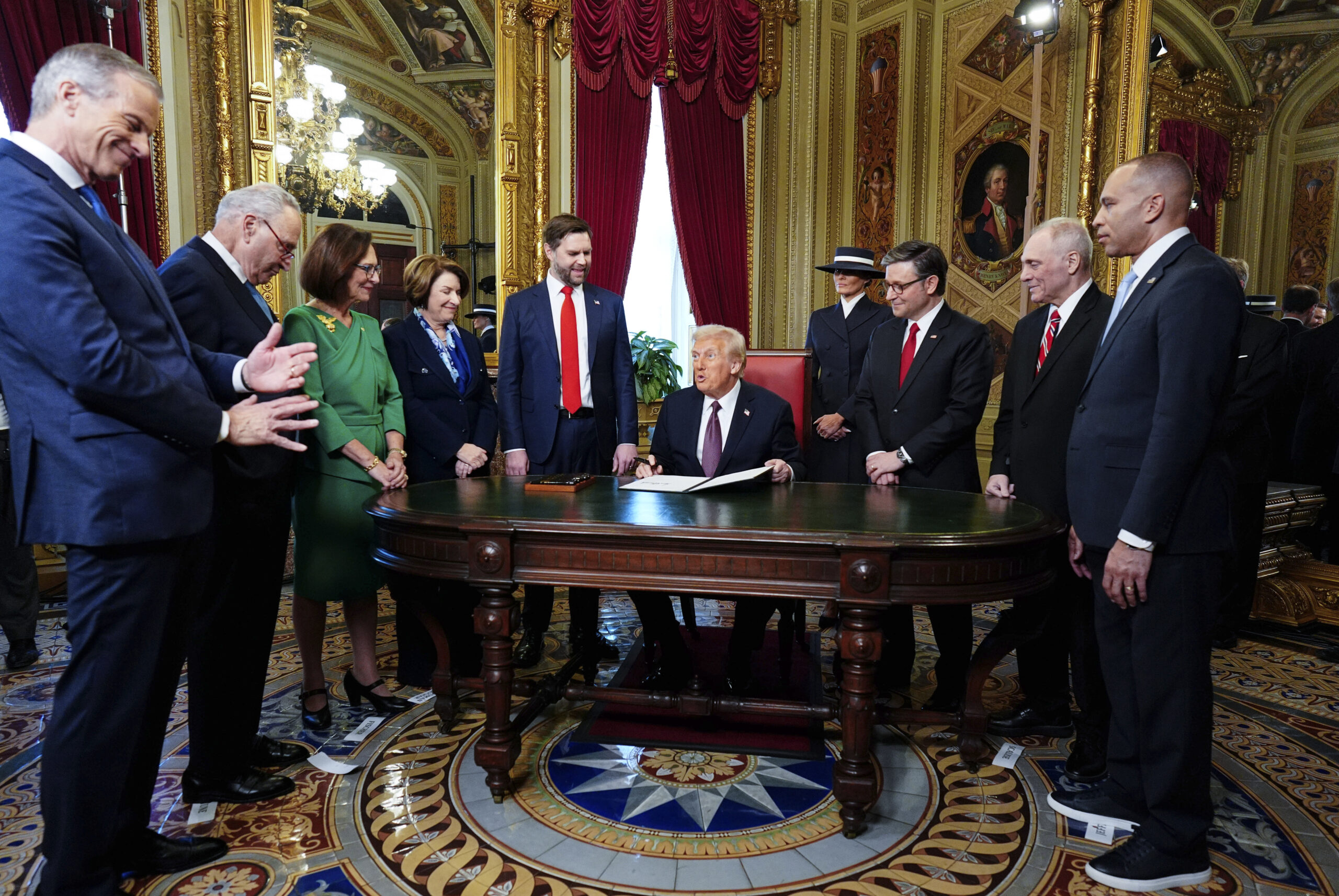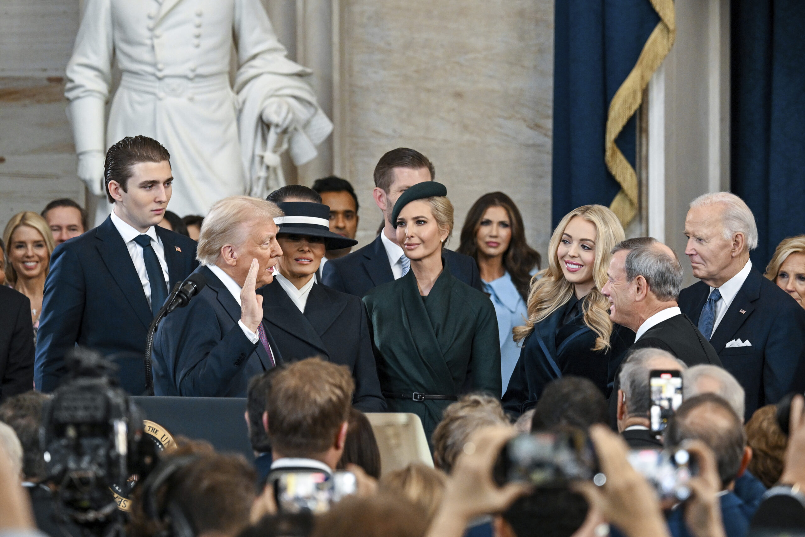 President Donald Trump, center, takes part in a signing ceremony in the President’s Room after the 60th Presidential Inauguration, Monday, Jan. 20, 2025, at the U.S. Capitol in Washington. (Melina Mara/The Washington Post via AP, Pool)President Donald Trump, center, takes part in a signing ceremony in the President’s Room after the 60th Presidential Inauguration, Monday, Jan. 20, 2025, at the U.S. Capitol in Washington. Surrounding the president are, from left, Senate Majority Leader Sen. John Thune, R-S.D.; Senate Minority Leader Chuck Schumer, D-N.Y.; Sen. Deb Fischer, R-Neb.; Sen. Amy Klobuchar, D-Minn.; Vice President JD Vance; first lady Melania Trump; House Speaker Mike Johnson, R-La.; House Majority Leader Steve Scalise, R-La.; and House Minority Leader Hakeem Jeffries, D-N.Y. (Melina Mara/The Washington Post via AP, Pool)Elon Musk arrives on stage to speak at an indoor Presidential Inauguration parade event in Washington, Monday, Jan. 20, 2025. (AP Photo/Susan Walsh)President Donald Trump speaks from Emancipation Hall as House Speaker Mike Johnson, from left, his wife Kelly Johnson, House Majority Leader Steve Scalise, R-La., and his wife Jennifer Scalise, listen after the 60th Presidential Inauguration, Monday, Jan. 20, 2025, at the U.S. Capitol in Washington. (Jasper Colt/Pool Photo via AP)Donald Trump is sworn in as the 47th president of the United States by Chief Justice John Roberts as Melania Trump holds the Bible during the 60th Presidential Inauguration in the Rotunda of the U.S. Capitol in Washington, Monday, Jan. 20, 2025. (AP Photo/Morry Gash, Pool)Former President Joe Biden and former Vice President Kamala Harris during the 60th Presidential Inauguration in the Rotunda of the U.S. Capitol in Washington, Monday, Jan. 20, 2025. (Chip Somodevilla/Pool Photo via AP)President Donald Trump, from right, and first lady Melania Trump walk with former President Joe Biden and Jill Biden to board a Marine helicopter as the Bidens depart to Joint Base Andrews after the 60th Presidential Inauguration, Monday, Jan. 20, 2025, at the U.S. Capitol in Washington. (Jack Gruber/Pool Photo via AP)From left, Larua Trump, Eric Trump, Elon Musk, Ivanka Trump, and Donald Trump Jr., stand together following the 60th Presidential Inauguration for President Donald Trump, in the Rotunda of the U.S. Capitol in Washington, Monday, Jan. 20, 2025. (Shawn Thew/Pool photo via AP)From left, former President Bill Clinton, former Secretary of State Hillary Clinton, and former President George W. Bush, speak following the 60th Presidential Inauguration for President Donald Trump, in the Rotunda of the U.S. Capitol in Washington, Monday, Jan. 20, 2025. (Shawn Thew/Pool photo via AP)Former President George W. Bush, former first lady Laura Bush and former President Barack Obama, speak after President Donald Trump was sworn in during the 60th Presidential Inauguration in the Rotunda of the U.S. Capitol in Washington, Monday, Jan. 20, 2025. (Shawn Thew/Pool photo via AP)President Donald Trump finishes his inaugural address as Vice President JD Vance applauds during the 60th Presidential Inauguration in the Rotunda of the U.S. Capitol in Washington, Monday, Jan. 20, 2025. (AP Photo/Julia Demaree Nikhinson, Pool)President Donald Trump speaks during the 60th Presidential Inauguration in the Rotunda of the U.S. Capitol in Washington, Monday, Jan. 20, 2025. (Chip Somodevilla/Pool Photo via AP)Attendees cheer as President Donald Trump speaks after taking the oath of office during the 60th Presidential Inauguration in the Rotunda of the U.S. Capitol in Washington, Monday, Jan. 20, 2025. (Kenny Holston/The New York Times via AP, Pool)People attend the 60th Presidential Inauguration in the Rotunda of the U.S. Capitol in Washington, Monday, Jan. 20, 2025. (AP Photo/Julia Demaree Nikhinson, Pool)President-elect Donald Trump, center left, takes the oath of office during the 60th Presidential Inauguration in the Rotunda of the U.S. Capitol in Washington, Monday, Jan. 20, 2025. (Kenny Holston/The New York Times via AP, Pool)President Donald Trump gestures to Supreme Court Chief Justice John Roberts after being sworn in as president during the 60th Presidential Inauguration in the Rotunda of the U.S. Capitol in Washington, Monday, Jan. 20, 2025. (Chip Somodevilla/Pool Photo via AP)President Joe Biden, center left, and first lady Jill Biden, left, greet President-elect Donald Trump, center right, and Melania Trump, right, upon arriving at the White House, Monday, Jan. 20, 2025, in Washington. (AP Photo/Evan Vucci)President Joe Biden and President-elect Donald Trump walk out to the presidential limousine, as they depart the White House, Monday, Jan. 20, 2025, in Washington, enroute to the Capitol. (AP Photo/Alex Brandon)President-elect Donald Trump takes the oath of office during the 60th Presidential Inauguration in the Rotunda of the U.S. Capitol in Washington, Monday, Jan. 20, 2025. (Saul Loeb/Pool photo via AP)President Donald Trump speaks during the 60th Presidential Inauguration in the Rotunda of the U.S. Capitol in Washington, Monday, Jan. 20, 2025. (Chip Somodevilla/Pool Photo via AP)President Donald Trump speaks after taking the oath of office during the 60th Presidential Inauguration in the Rotunda of the U.S. Capitol in Washington, Monday, Jan. 20, 2025. (Kenny Holston/The New York Times via AP, Pool)Supreme Court Chief Justice John Roberts, right, administers the presidential oath to President-elect Donald Trump, as President Joe Biden, right, looks on during the 60th Presidential Inauguration in the Rotunda of the U.S. Capitol in Washington, Monday, Jan. 20, 2025. (Shawn Thew/Pool photo via AP)Donald Trump is sworn in as the 47th president of the United States by Chief Justice John Roberts as Melania Trump holds the Bible during the 60th Presidential Inauguration in the Rotunda of the U.S. Capitol in Washington, Monday, Jan. 20, 2025. (AP Photo/Morry Gash, Pool)Vice President-elect JD Vance, left, takes oath as 