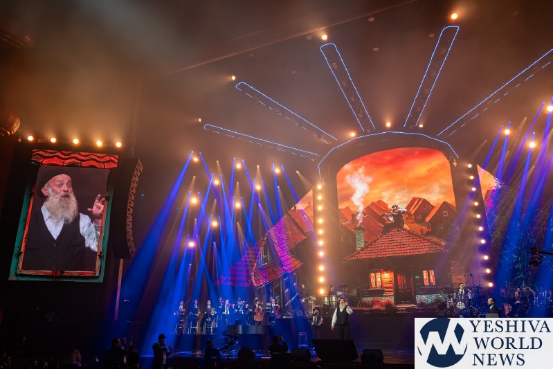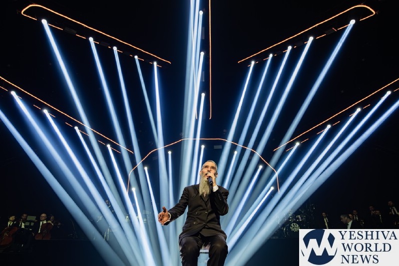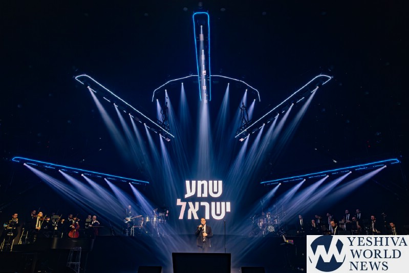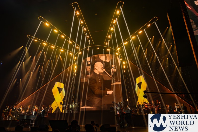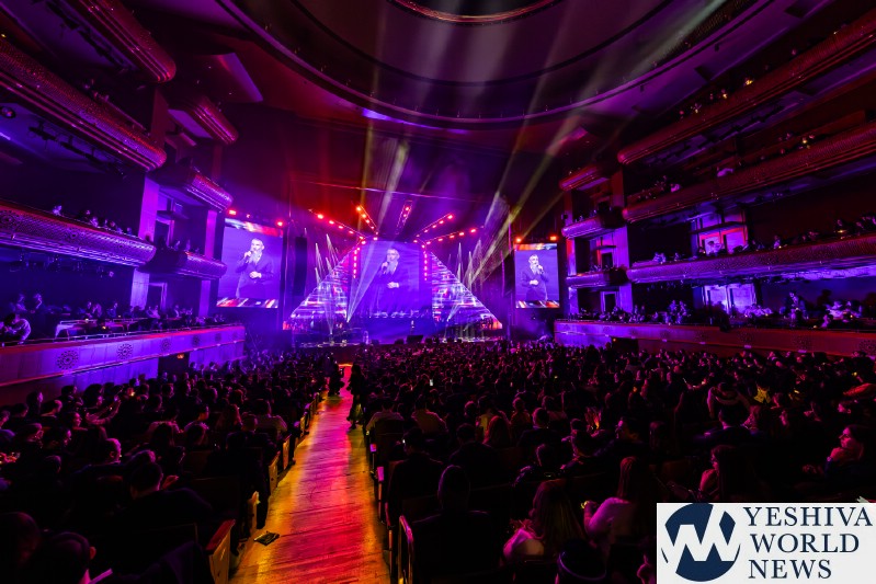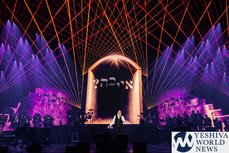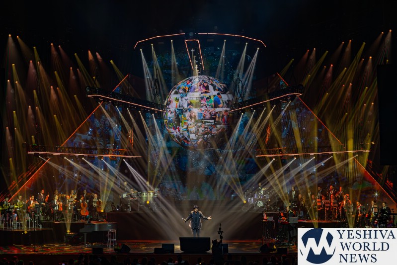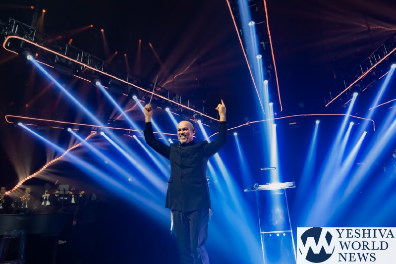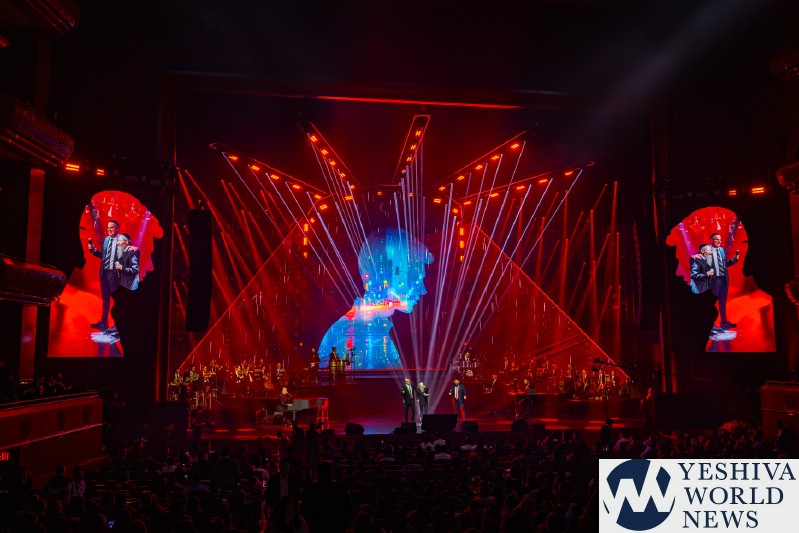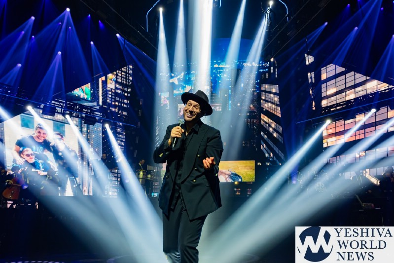 After discussing the importance of the day, mainly the three hostages released and how we hope to see all of them returned to their families, Nachum mentioned the glow in the dark wristbands by each seat. These wristbands would be synced to a wider system making them light up and blink at the same time. It would be an interactive part of the evening’s performances. The overture began with the Freilach Orchestra playing, along with a young boy featured on the monitor amidst the noise and hustle and bustle of NY. Each of these “noises” combined to make the world famous HASC theme intro, composed by Yisroel Lamm 38 years ago. The visual finished with the young man on stage holding a conductor’s wand, conducting the Freilach Orchestra.