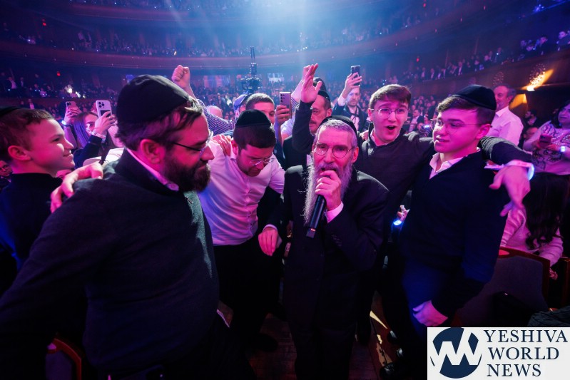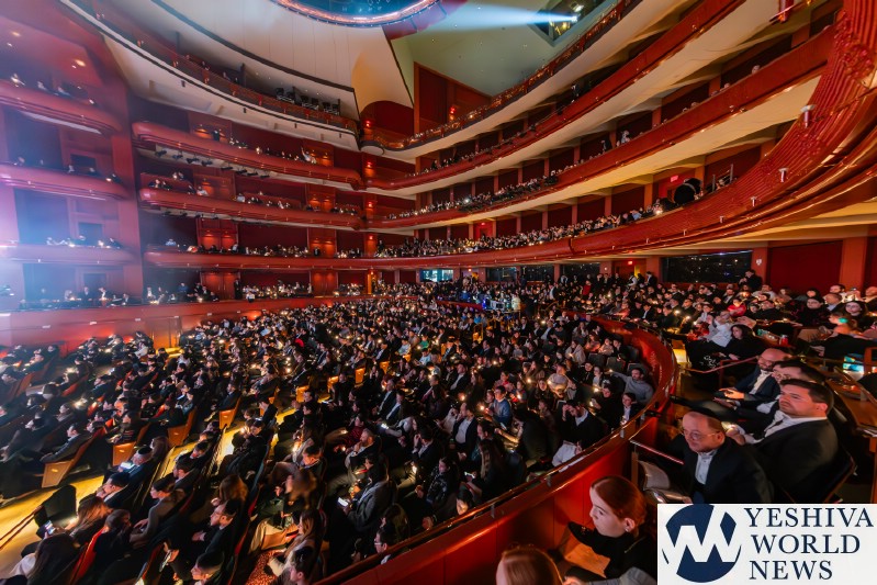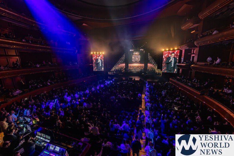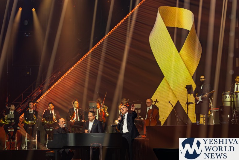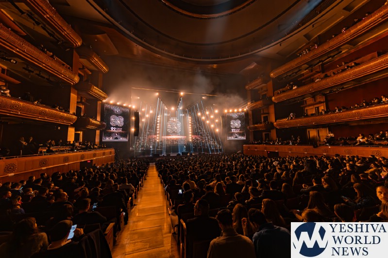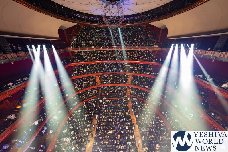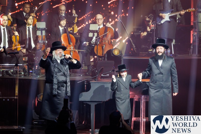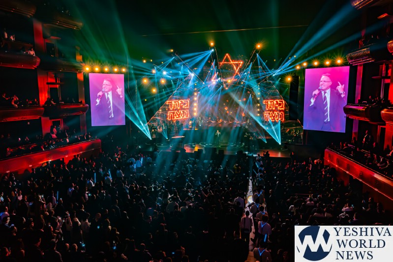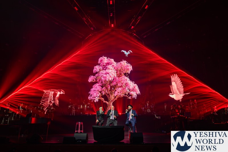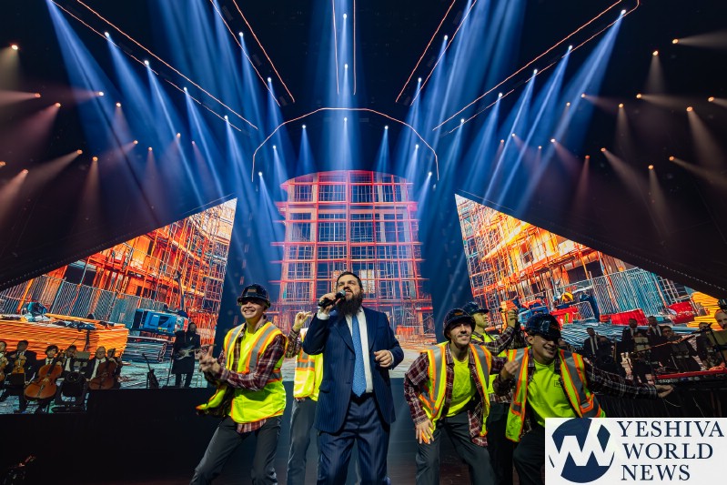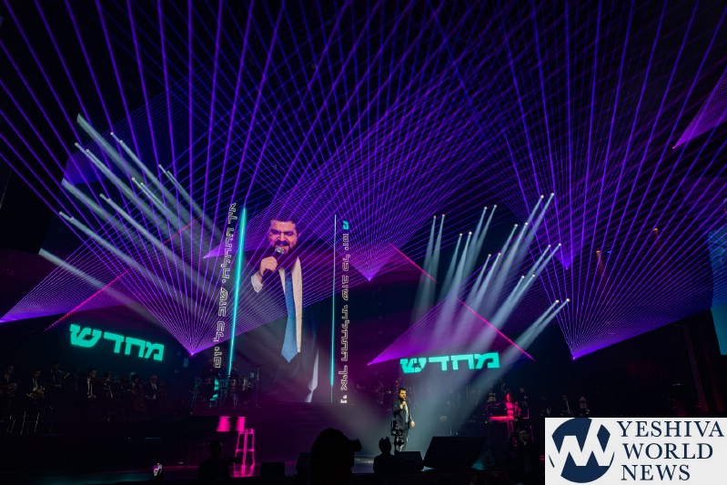 After discussing the importance of the day, mainly the three hostages released and how we hope to see all of them returned to their families, Nachum mentioned the glow in the dark wristbands by each seat. These wristbands would be synced to a wider system making them light up and blink at the same time. It would be an interactive part of the evening’s performances. The overture began with the Freilach Orchestra playing, along with a young boy featured on the monitor amidst the noise and hustle and bustle of NY. Each of these “noises” combined to make the world famous HASC theme intro, composed by Yisroel Lamm 38 years ago. The visual finished with the young man on stage holding a conductor’s wand, conducting the Freilach Orchestra.