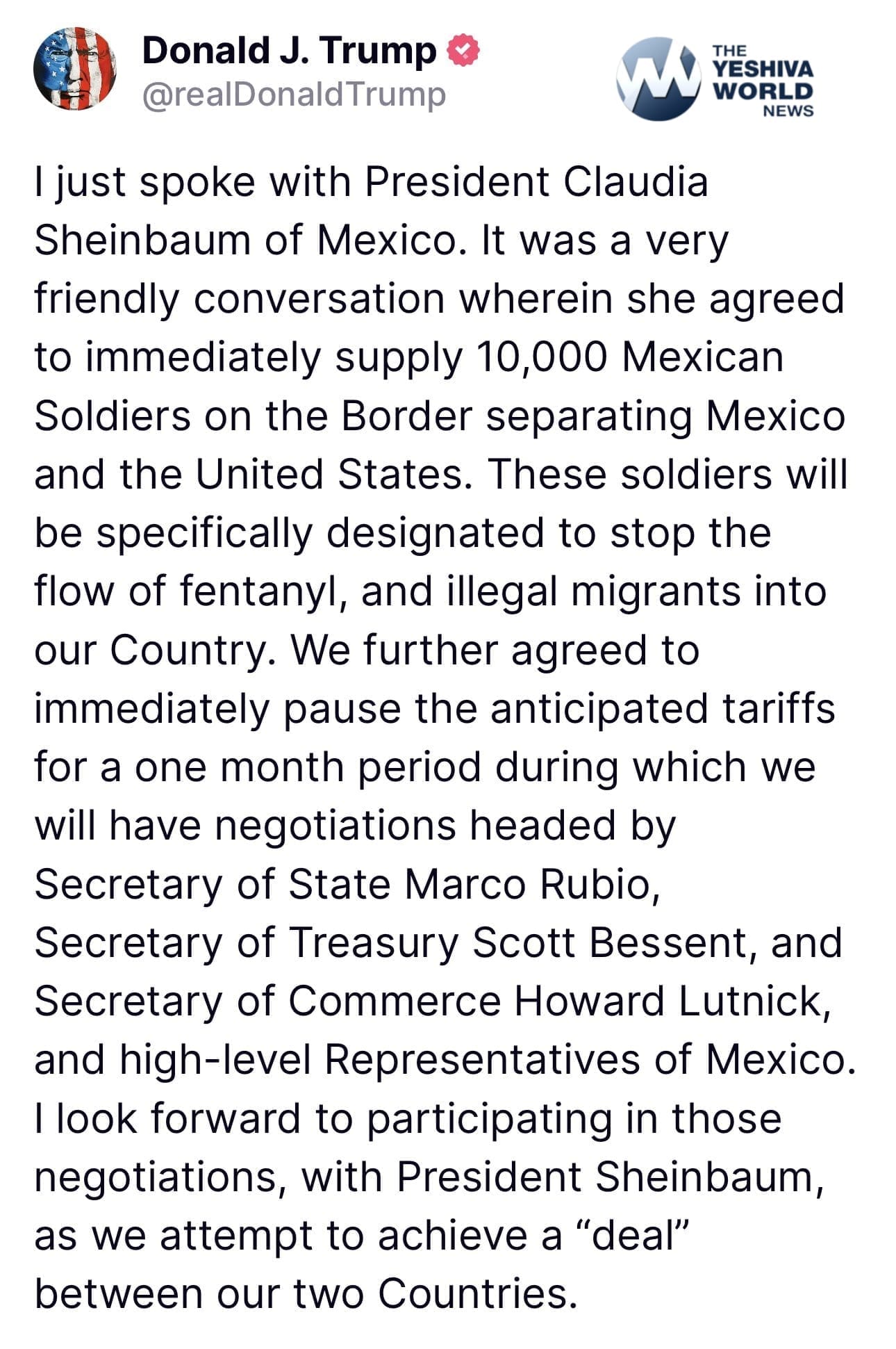 “I look forward to participating in those negotiations, with President Sheinbaum, as we attempt to achieve a ‘deal’ between our two Countries,” the president said on social media.