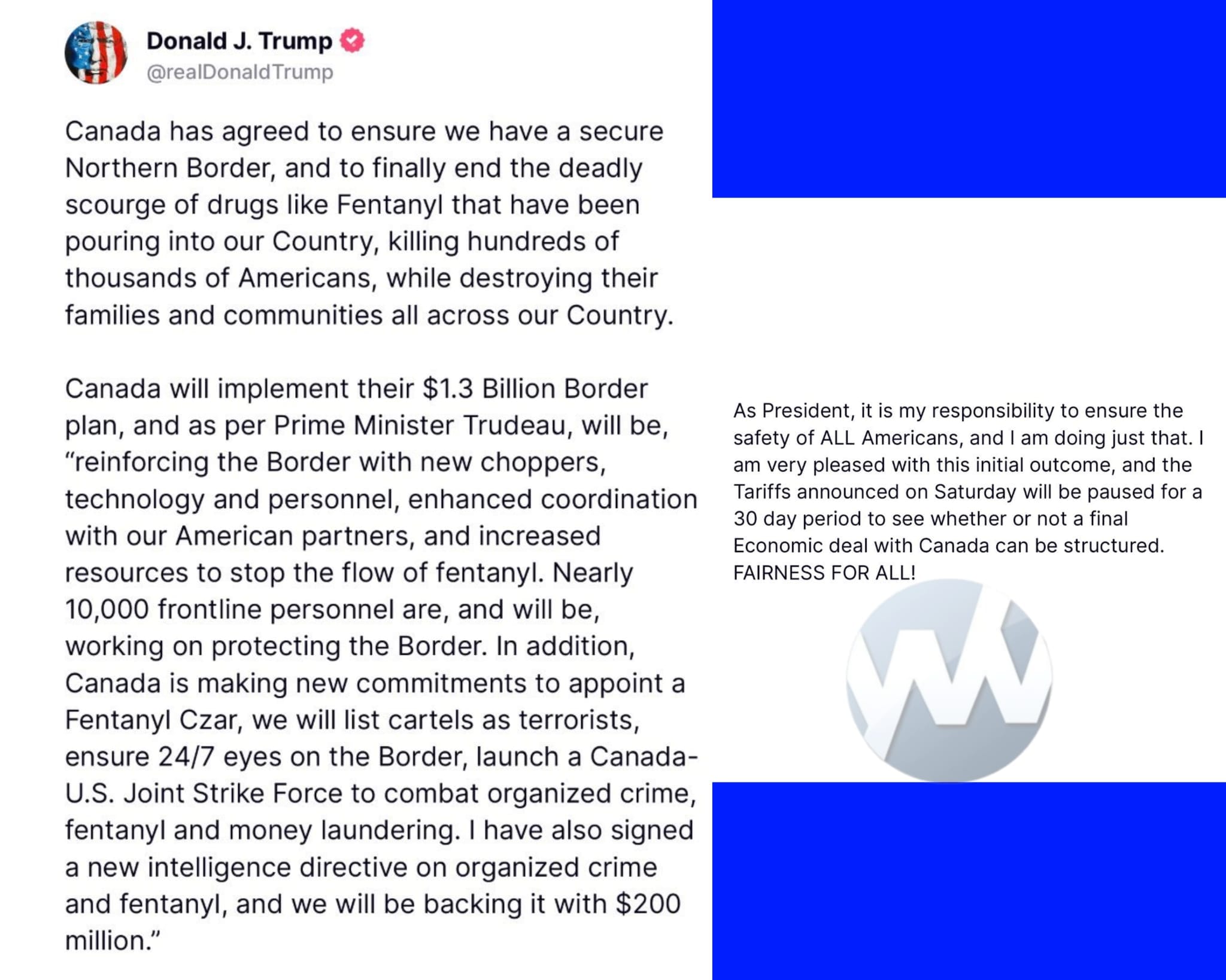 Contrary to the dismissive comments here, the fact remains that the harsh rhetoric that had been coming from Mexico and Canada has abruptly ceased and reversed course. I am here in Canada and I can say that it is obvious from Trudeau’s press speech that Trudeau had the wind knocked out of him. And while there may previously have been some nominal commitment of funds to expanded border security, past experience has shown that allocated funds tend to be siphoned off to unrelated matters. But now the U.S. will be watching whether the funds will really be used to fulfil their promise. And despite the first commentators remarks, Trump is not trying to get every deal completed in one swipe. Negotiations don’t work that fast. The first objective is to get them to the table. And in terms of things like inflation and the stock market, the argument works in both directions and Canada has a lot more to be concerned about than the U.S. And most probably this was the intended strategy all along.