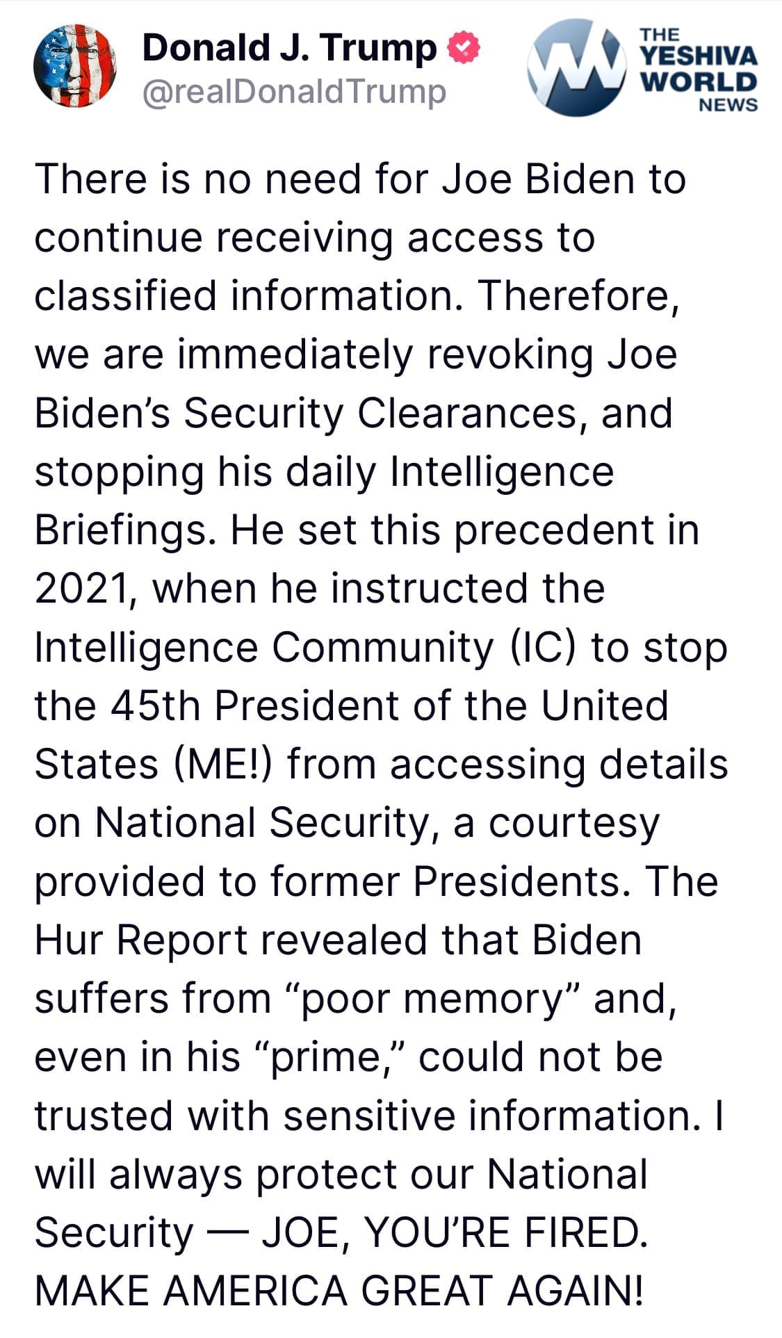 “There is no need for Joe Biden to continue receiving access to classified information. Therefore, we are immediately revoking Joe Biden’s Security Clearances, and stopping his daily Intelligence Briefings,” Trump wrote. “He set this precedent in 2021, when he instructed the Intelligence Community (IC) to stop the 45th President of the United States (ME!) from accessing details on National Security, a courtesy provided to former Presidents.”