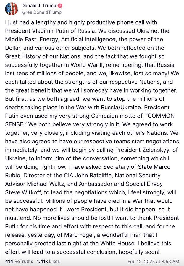 “We agreed to work together, very closely, including visiting each other’s Nations. We have also agreed to have our respective teams start negotiations immediately, and we will begin by calling President Zelenskyy, of Ukraine, to inform him of the conversation, something which I will be doing right now.”