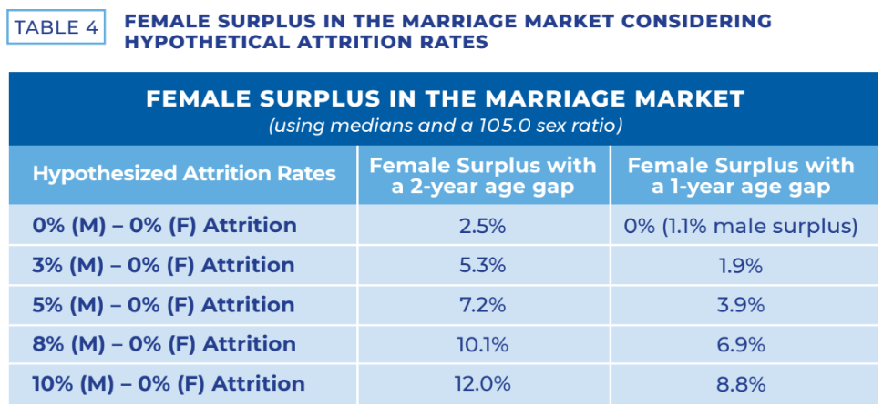 Now, let’s talk about the actual “crisis.” The actuarial models show that, due to the age gap, between 2.5% and 6.2% of women may struggle to find a spouse within the sample population. That number isn’t pulled out of thin air—it’s backed by research (Table 3).