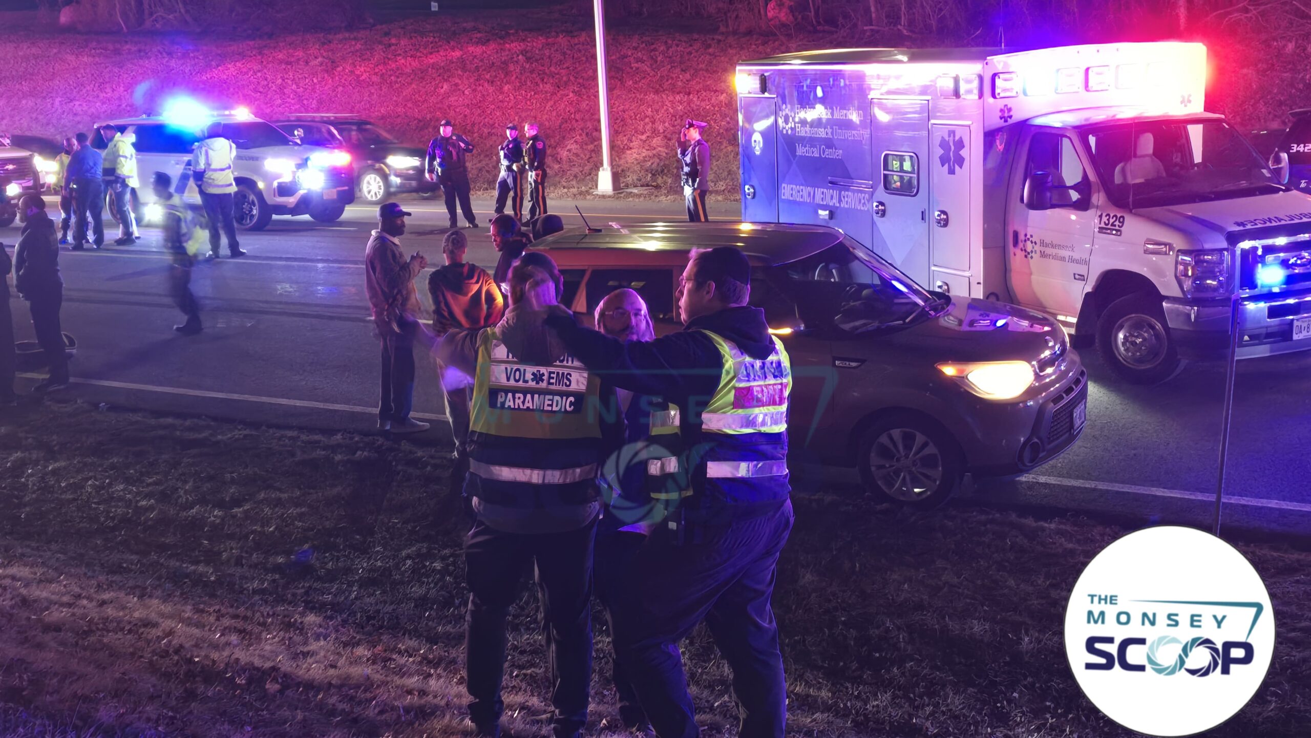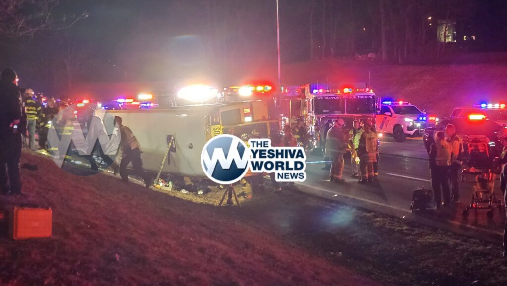 UPDATE: The Skverer Bochur critically injured in the overturned bus was rushed to Valley Hospital in New Jersey by Rockland Hatzolah Paramedics. He is listed in extremely critical condition. His name for Tehillim is Naftali Ben Basya.