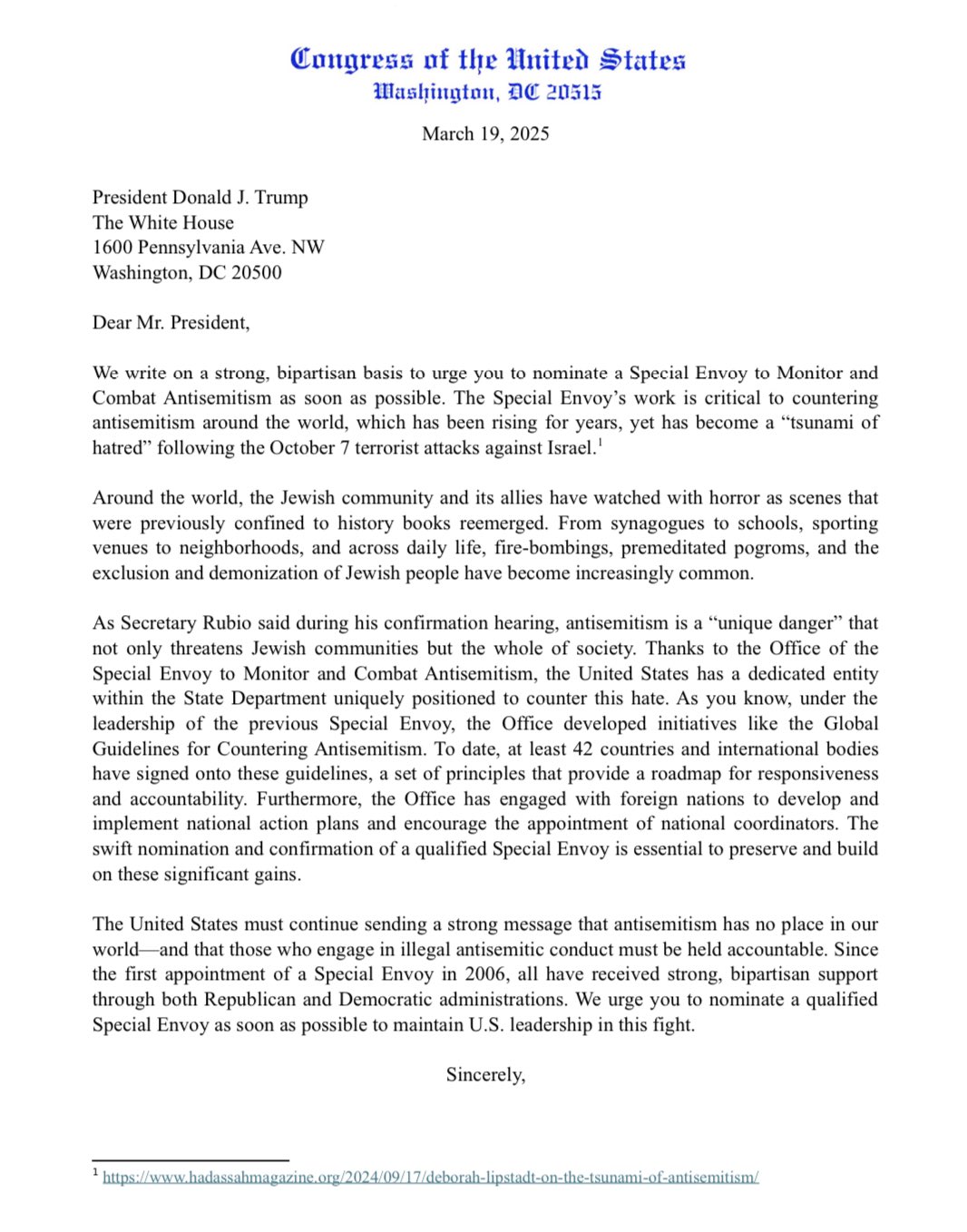 The letter concludes with a call for immediate action, warning that the failure to fill the position could hinder efforts to combat rising antisemitism. “The swift nomination and confirmation of a qualified special envoy is essential to preserve and build on these significant gains,” the lawmakers urged.