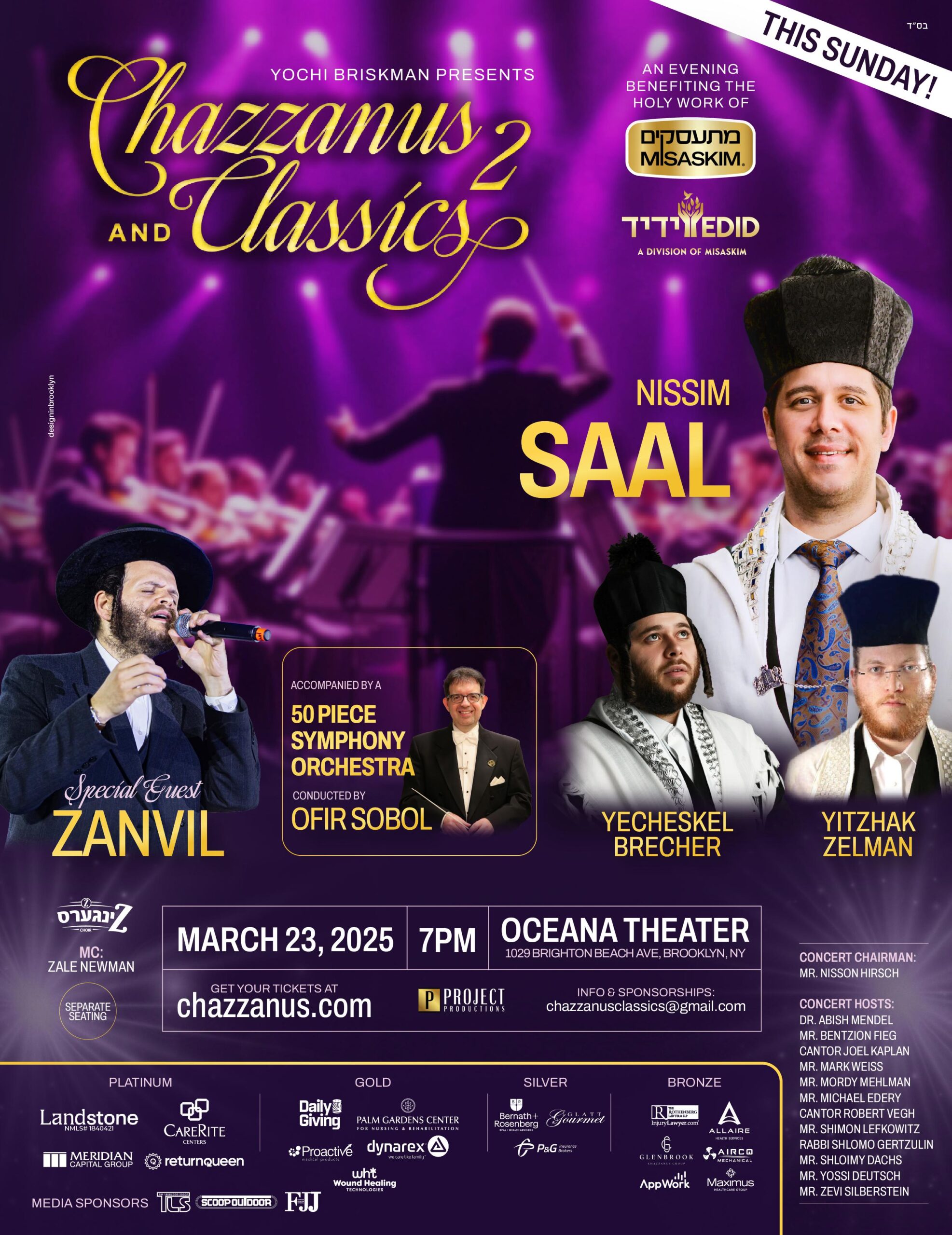 Headlining this extraordinary event is the renowned Nissim Saal, joined by the powerful voices of Yecheskel Brecher and Yitzhak Zelman. As a special treat, the evening will feature the electrifying Zanvil, whose voice has captivated audiences worldwide.