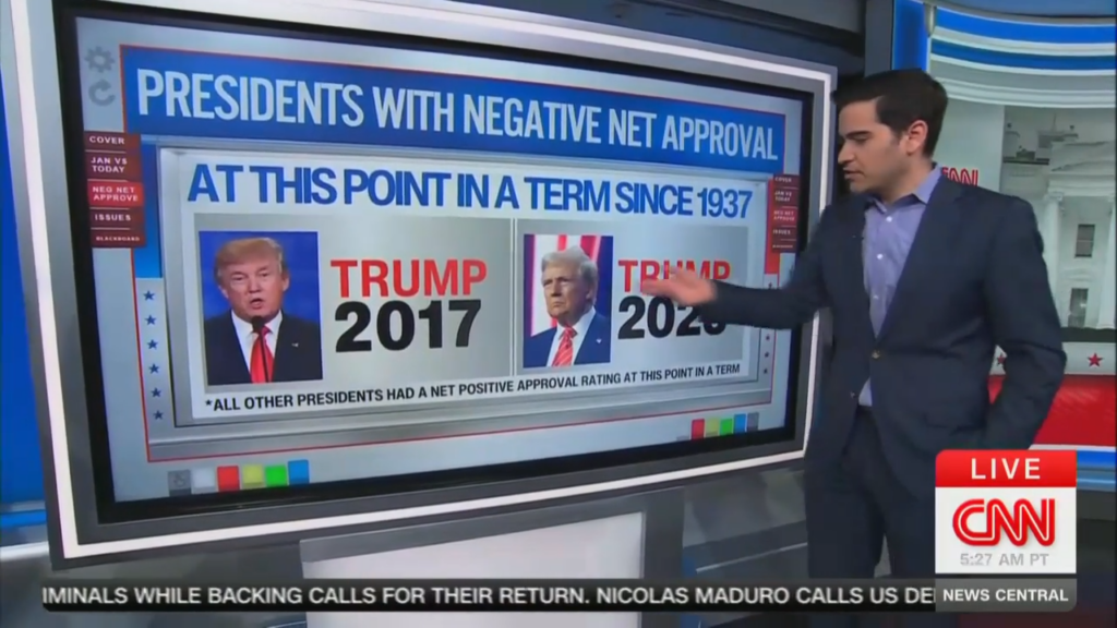 Comparing Trump’s approval ratings over time, Enten noted that while Trump started his second term in positive territory with a net approval of +7 in January 2025, he has since fallen underwater to -2.