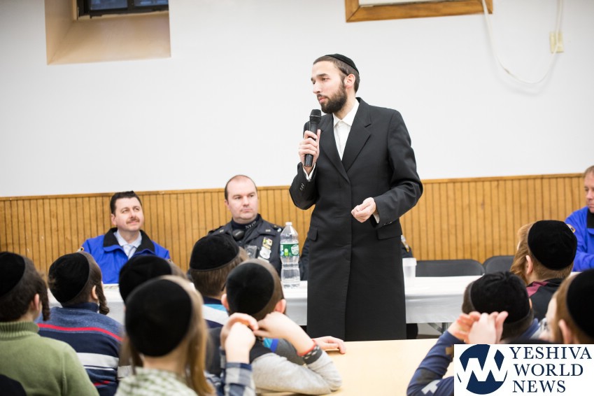 Assemblyman Simcha Eichenstein and the New York Police Department visit the Boyaner Cheder in Borough Park in Brooklyn, New York on Thursday, January 30, 2020. CREDIT: Benjamin Kanter