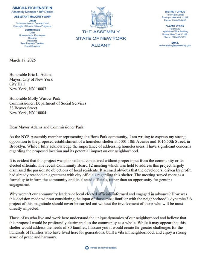 New York State Assemblyman Simcha Eichenstein penned a sharply worded letter to New York City Mayor Eric Adams and to NYC Department of Social Services Commissioner Molly Wasow Park, expressing his strong opposition to the decision to place a shelter for homeless families in Boro Park at a location that would adversely affect the surrounding area.