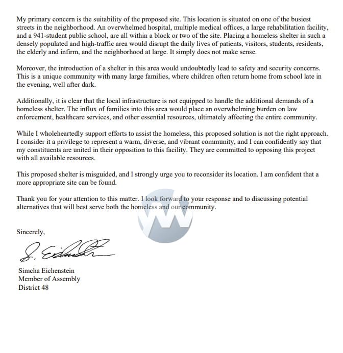 Assemblyman Eichenstein pointed out safety and security concerns, especially considering the many children who return home from school in the evening, well after dark. He also expressed concern about the overwhelming burden that a shelter would place on local law enforcement, healthcare services, and other essential resources.