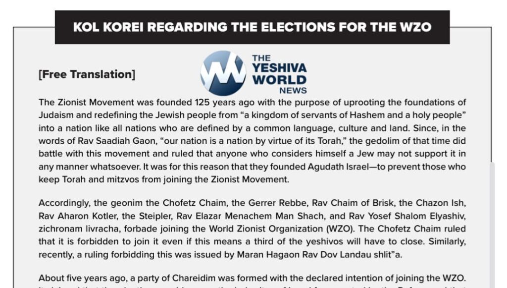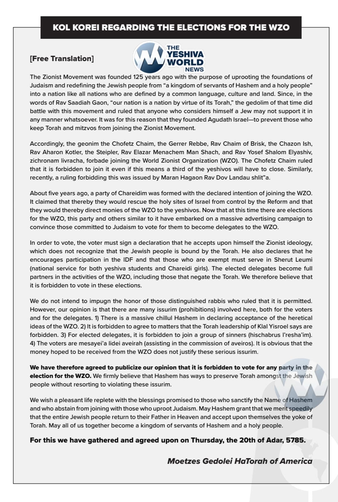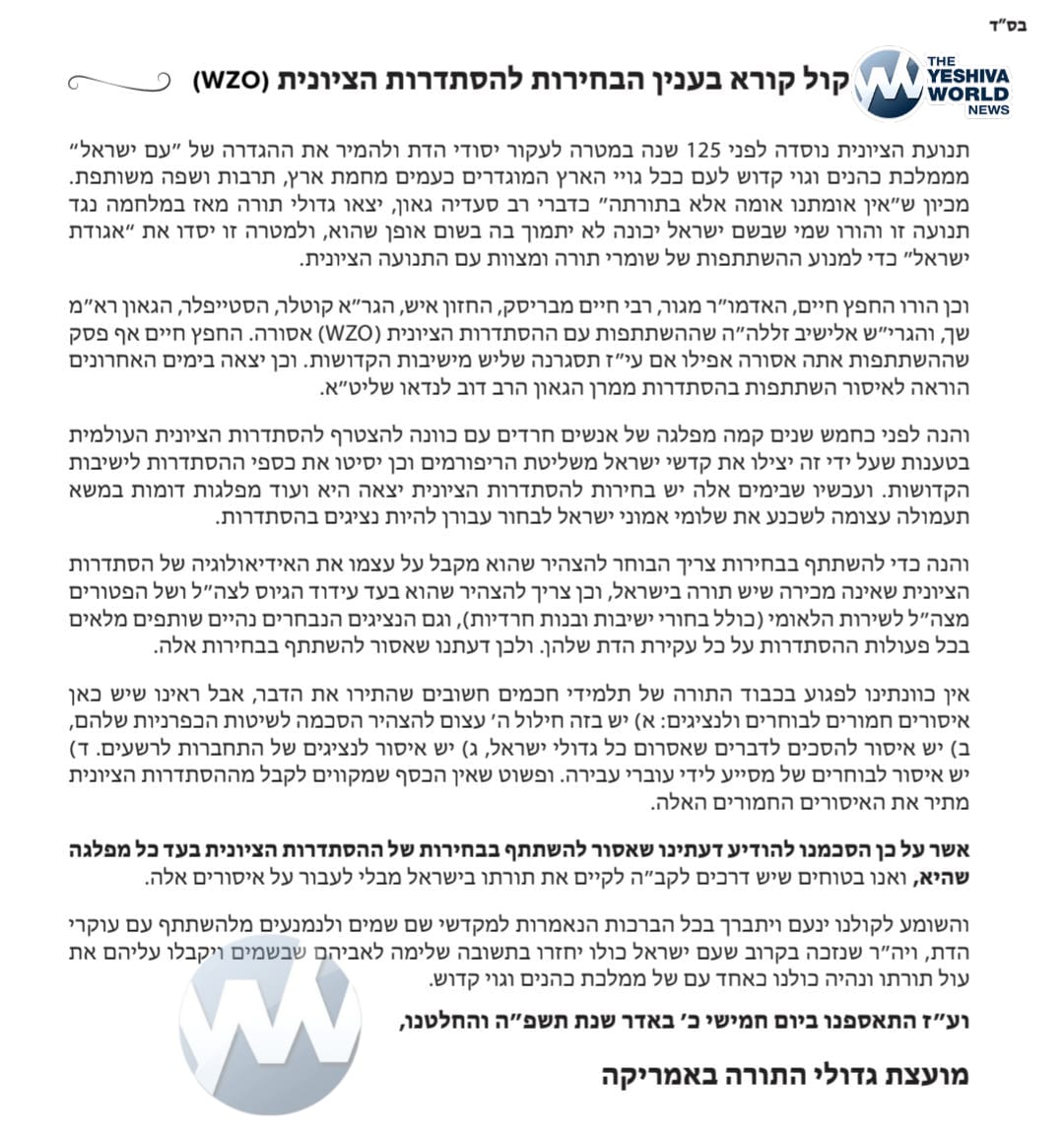 We have therefore agreed to publicize our opinion that it is forbidden to vote for any party in the election for the WZO. We firmly believe that Hashem has ways to preserve Torah amongst the Jewish people without resorting to violating these issurim.