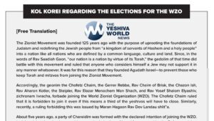 The Moetzes Gedolei HaTorah met last Thursday to discuss the issue of voting in the ongoing World Zionist Organization elections. On Tuesday, they issued the following Kol Korei: The Zionist Movement was founded 125 years ago with the purpose of uprooting the foundations of Judaism and redefining the Jewish people from “a kingdom of servants … Continue reading KOL KOREH: Moetzes Gedolei Hatorah Of America: It Is Assur To Vote In WZO Election