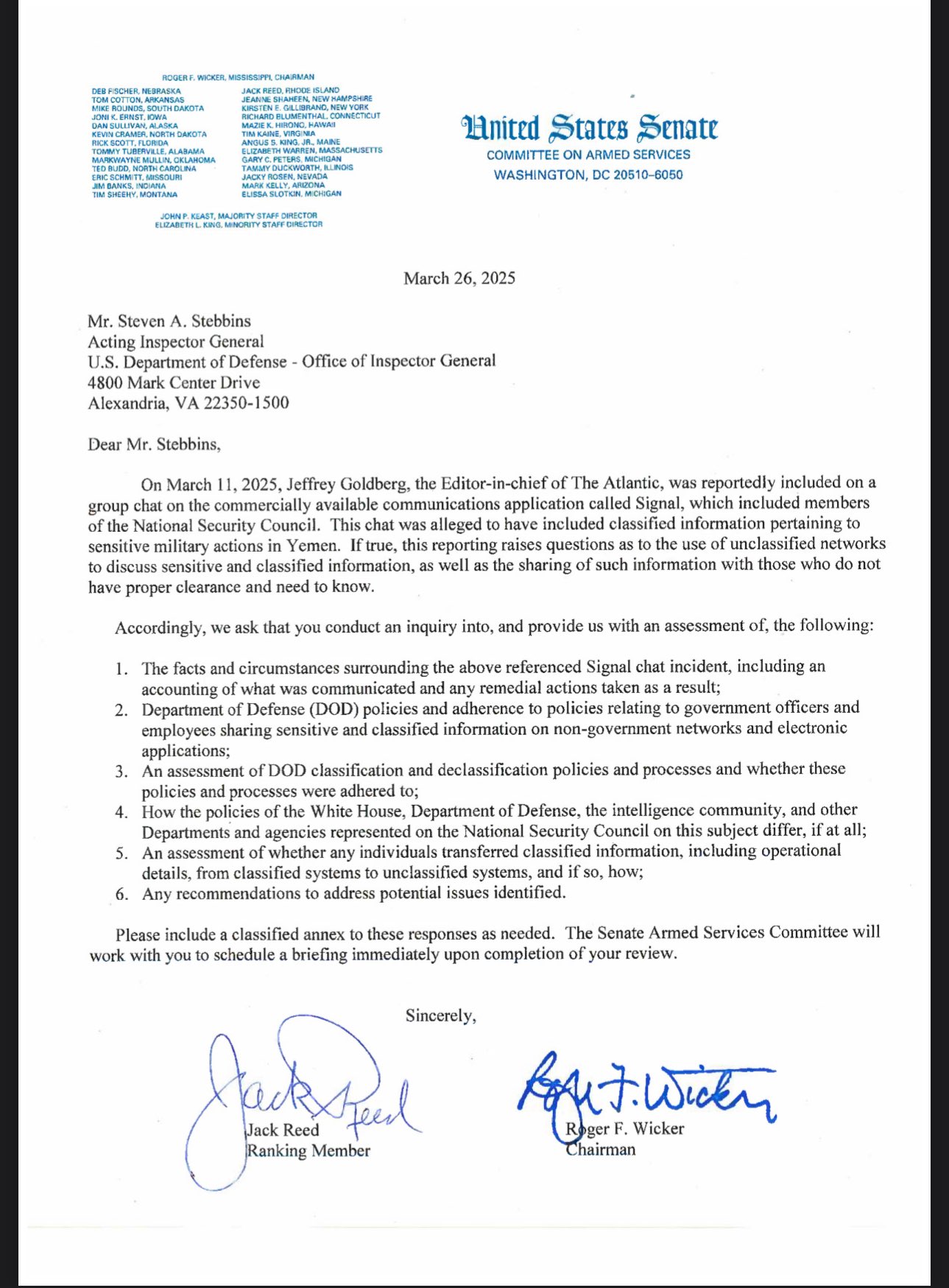 Senator Roger Wicker (R-MS), chairman of the Senate Armed Services Committee, and ranking member Senator Jack Reed (D-RI) have formally requested that the Department of Defense investigate a high-profile security breach involving a Signal group chat where top U.S. officials allegedly discussed airstrikes in Yemen.