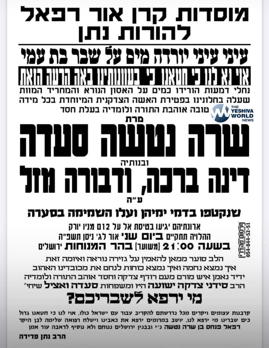 The niftarim leave behind a grieving husband and father, Sidney Saada, as well as their surviving sons, Philip and Jacob. The unbearable loss is also felt by Natasha’s parents, Jack and Shahin Assil, and her siblings, Anoshka Saada, David Assil, and Sammy Assil.