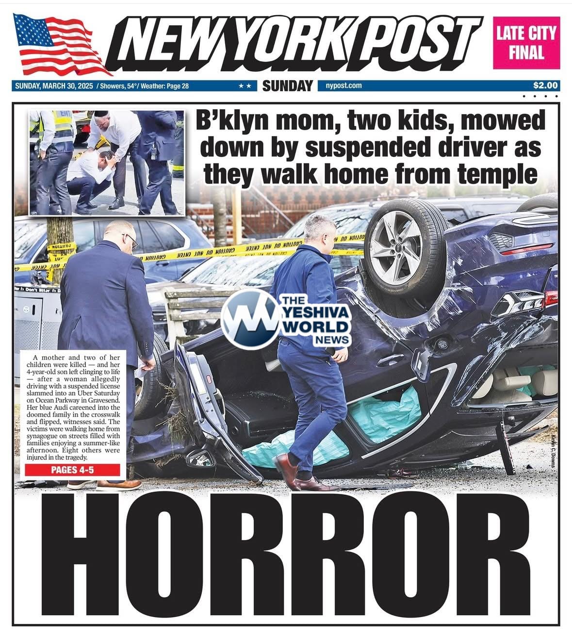 The tragedy unfolded on Shabbos afternoon when a vehicle, operated by Miriam Yarimi, 32, plowed into the young mother and her daughters on Ocean Parkway near Quentin Road. Natasha A”H, Diana A”H, and Debra A”H were tragically niftar at the scene, while four-year-old Pinchas Raphael Ben Sarah remains in extremely critical condition, and Klal Yisroel is urged to be mispallel for his refuah sheleimah.