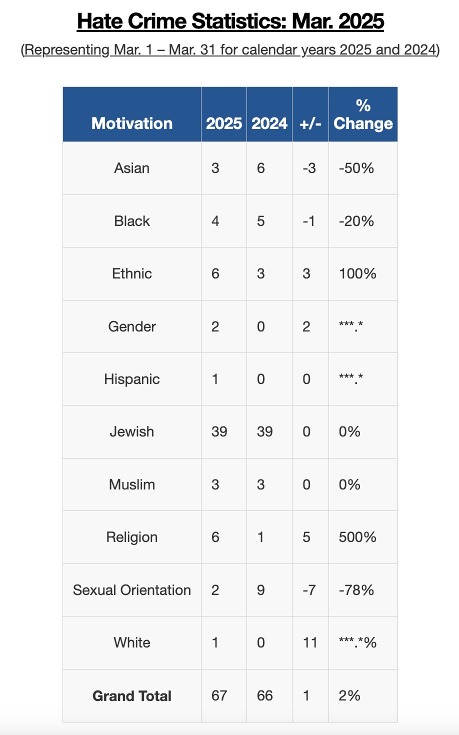 The total number of reported hate crimes in March was 67. Antisemitic acts alone made up 58% of that figure, continuing a disturbing trend that has played out month after month across the five boroughs.