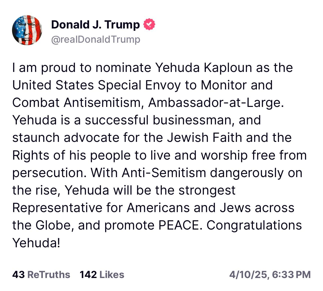 “I am proud to nominate Yehuda Kaploun as the United States Special Envoy to Monitor and Combat Antisemitism, Ambassador-at-Large,” Trump wrote. “Yehuda is a successful businessman and staunch advocate for the Jewish Faith and the Rights of his people to live and worship free from persecution. With Anti-Semitism dangerously on the rise, Yehuda will be the strongest Representative for Americans and Jews across the Globe, and promote PEACE. Congratulations Yehuda!”
