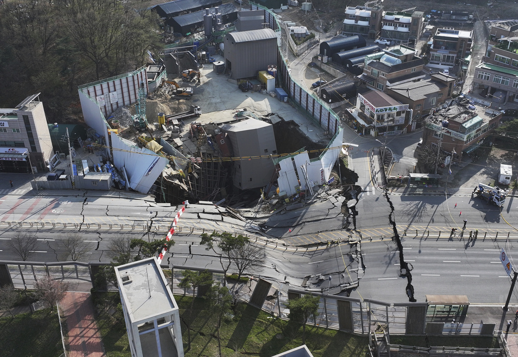 A subway tunnel construction site collapses in Gwangmyeong, South Korea, Friday, April 11, 2025. (Hong Ki-won/Yonhap via AP)