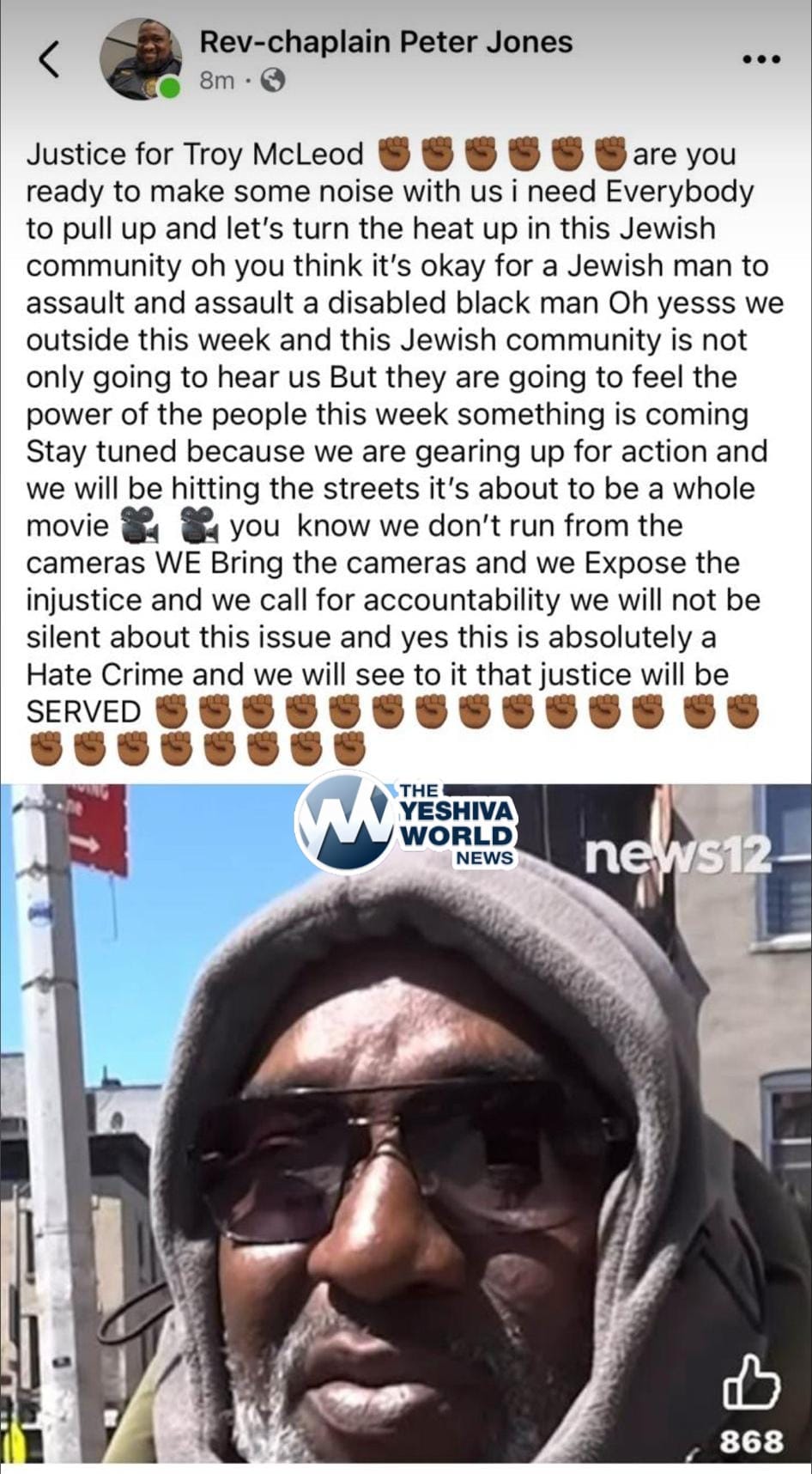 The flyer included deeply troubling language: “Assaulted in a wheelchair by members of the Orthodox Jewish community.” One post said, “Shame on the Jewish community — this is despicable.”