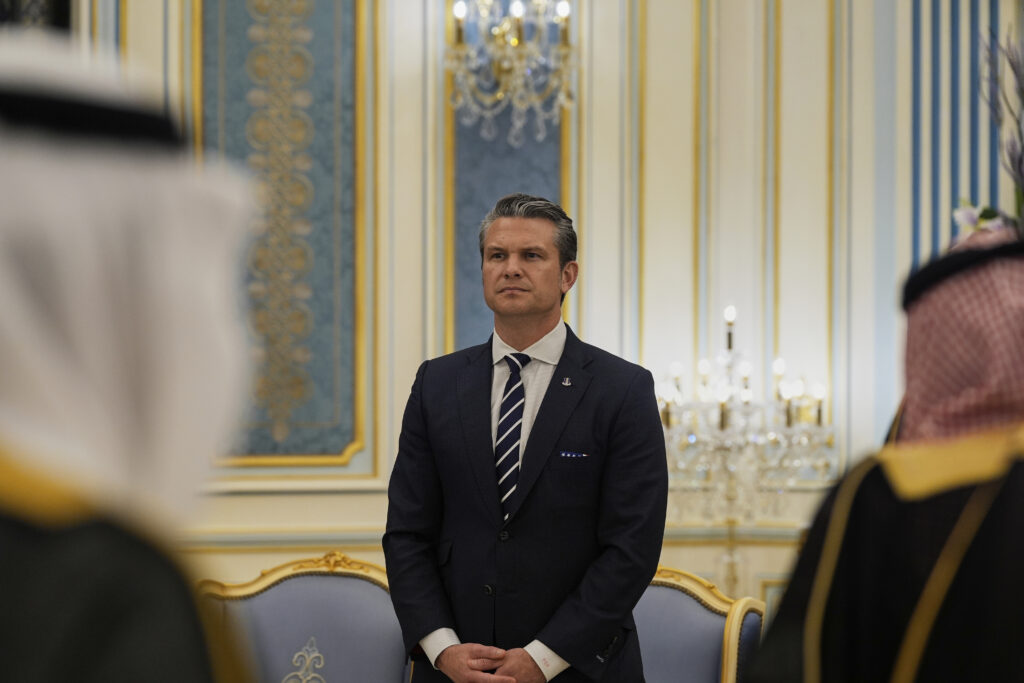 Secretary of Defense Pete Hegseth attends a welcome ceremony for President Donald Trump hosted by Saudi Crown Prince Mohammed bin Salman at the Royal Palace in Riyadh, Saudi Arabia, Tuesday, May 13, 2025. (AP Photo/Alex Brandon)